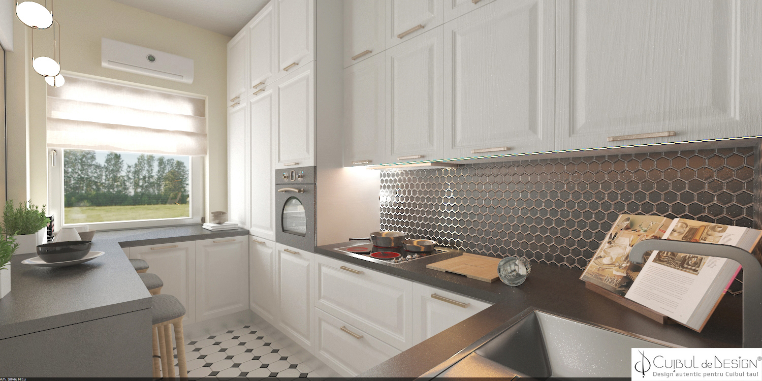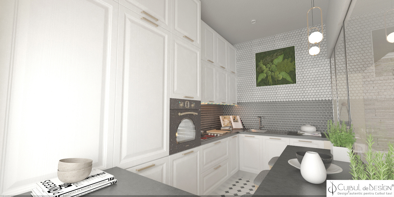 Bucatria este realizata cu fronturi de usi din MDF frezat vopsit alb mat. Mainerele aurii ii confera acesteia o nota eleganta. Corpurile de mobilier suprapuse ajuta ca tot spatiul sa devina functional, utilizand nu numai suprafata pardoselii pentru depozitare cat si inaltimea camerei.