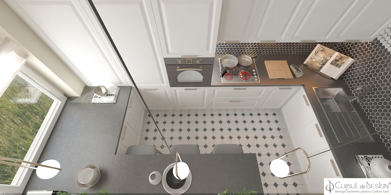 Intoarcerea blatului catre geamul cu vizibilitate catre living reda spatialitate. Aceasta se poate folosi atat ca loc de luat masa cat si ca blat de lucru.
