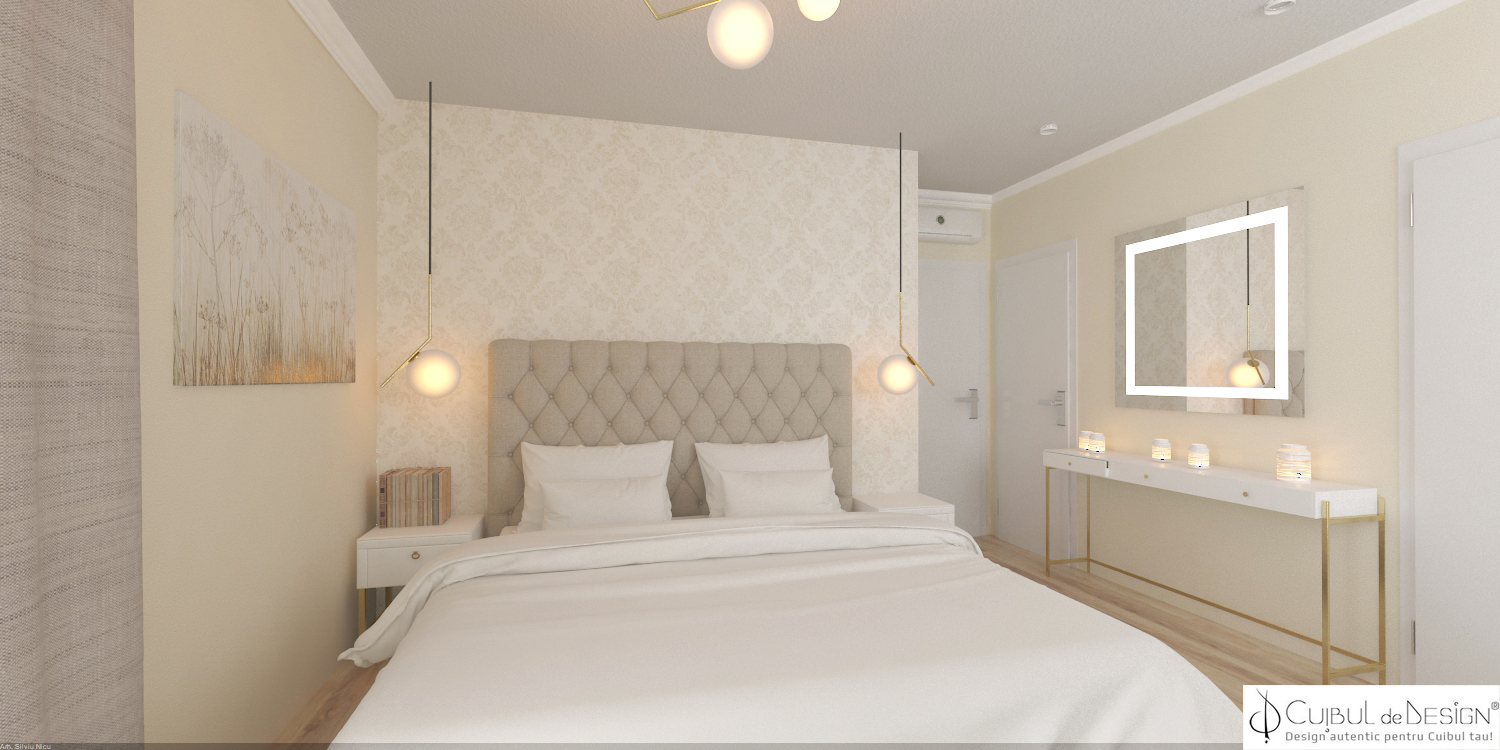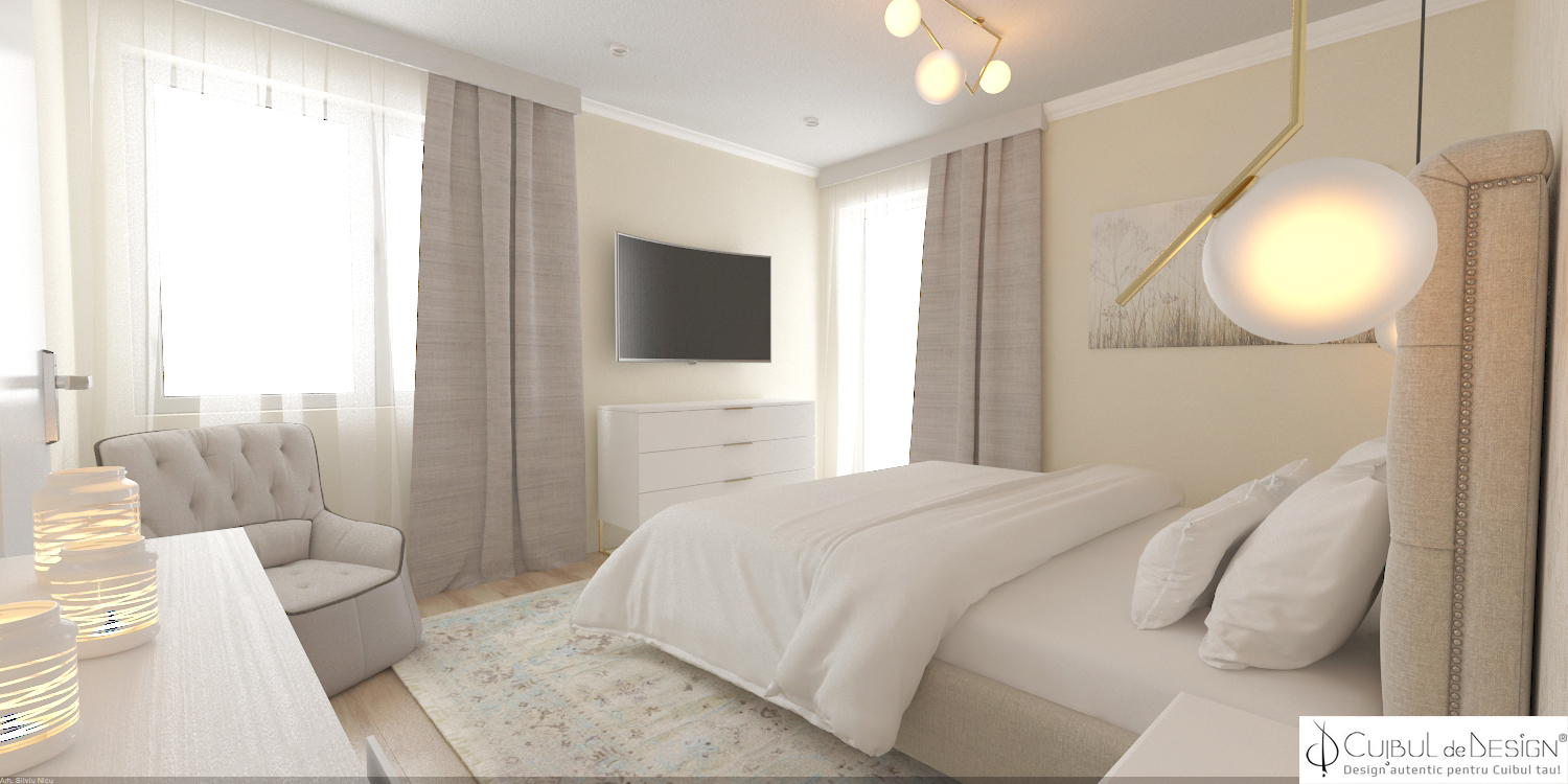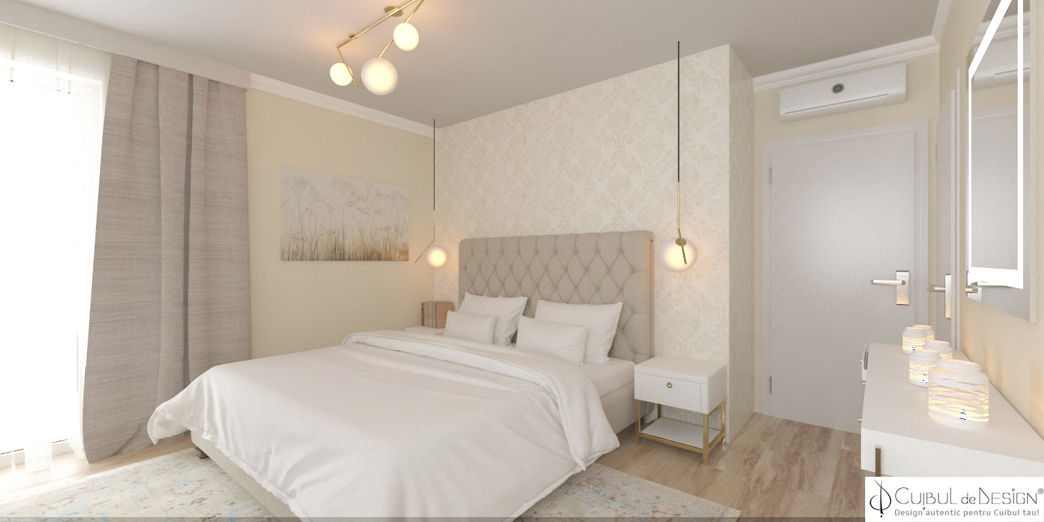 Pentru dormitor am pastrat aceias cromatica calda. Aici am creat un joc de texturi, un mix intre lavabila, tapet, textilul de la pat, covor si draperii.