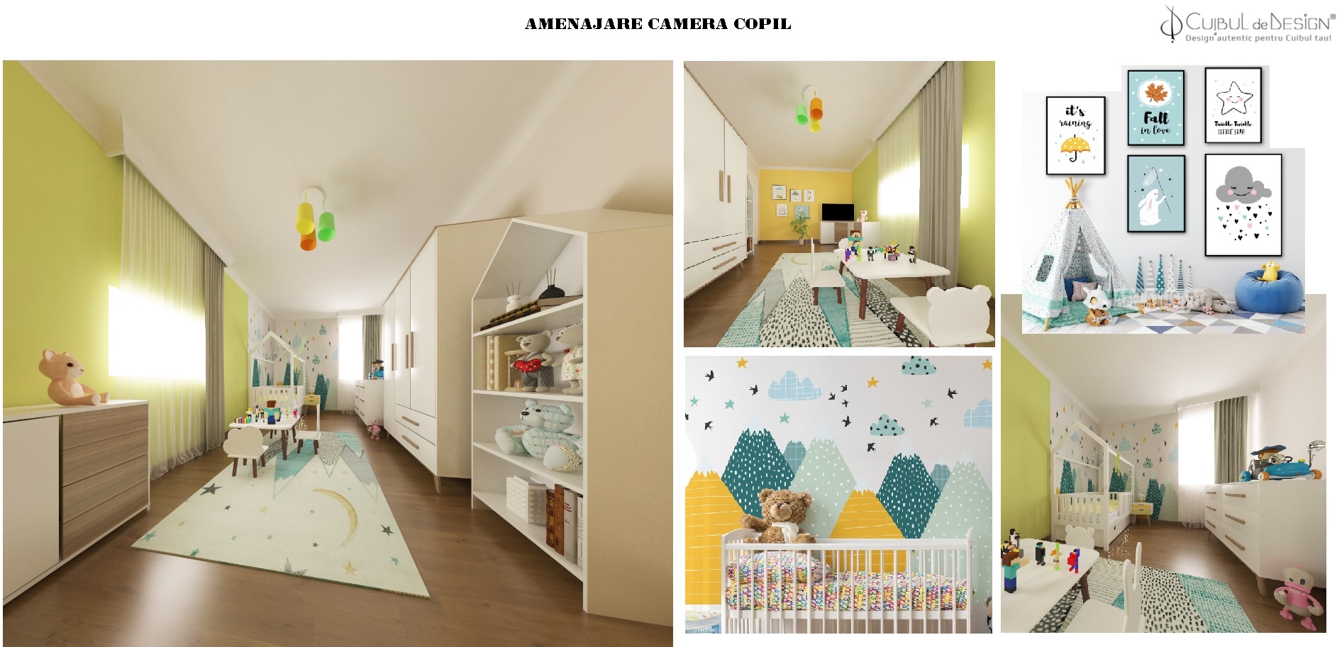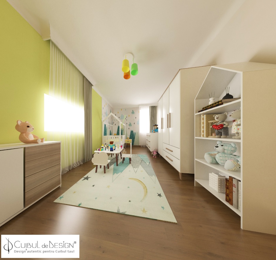 Amenajarea camerei copilului este un proiect menit sa imbine decorurile creative cu nevoile celui mic dar si cu nevoile practice ale parintilor. Am creat un spatiu vesel, cu mai multe functiuni. Zona de somn in care am incadrat patul Montessori de tip casuta, cel mai iubit pat de catre copii. Zona de joaca cu masuta si scaunele unde isi poate dezvolta abilitatile creative prin desen si practicarea diferitelor jocuri impreuna cu parintii sau cu prietenii, ulterior putand fi transformata intr-un birou. O zona de depozitare alcatuita din dulap pentru haine, comode cu sertare si rafturi pentru jucarii si carti. Un decor în culori vesele, un ambient funcțional și creativ!