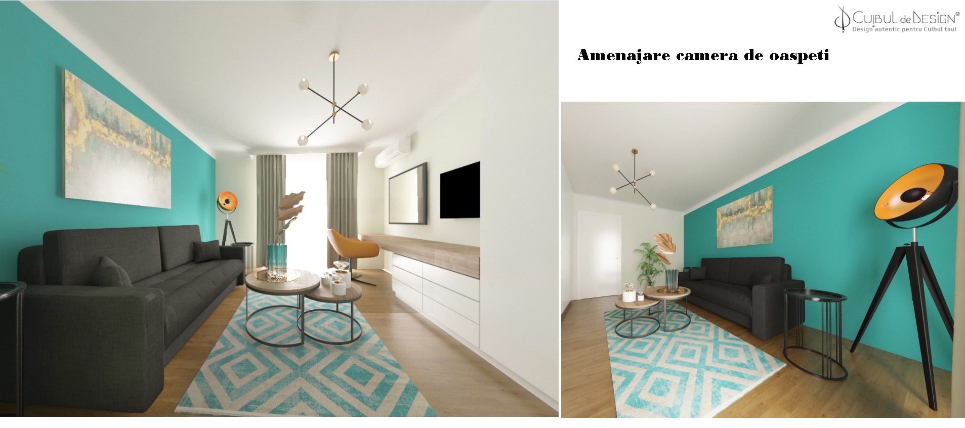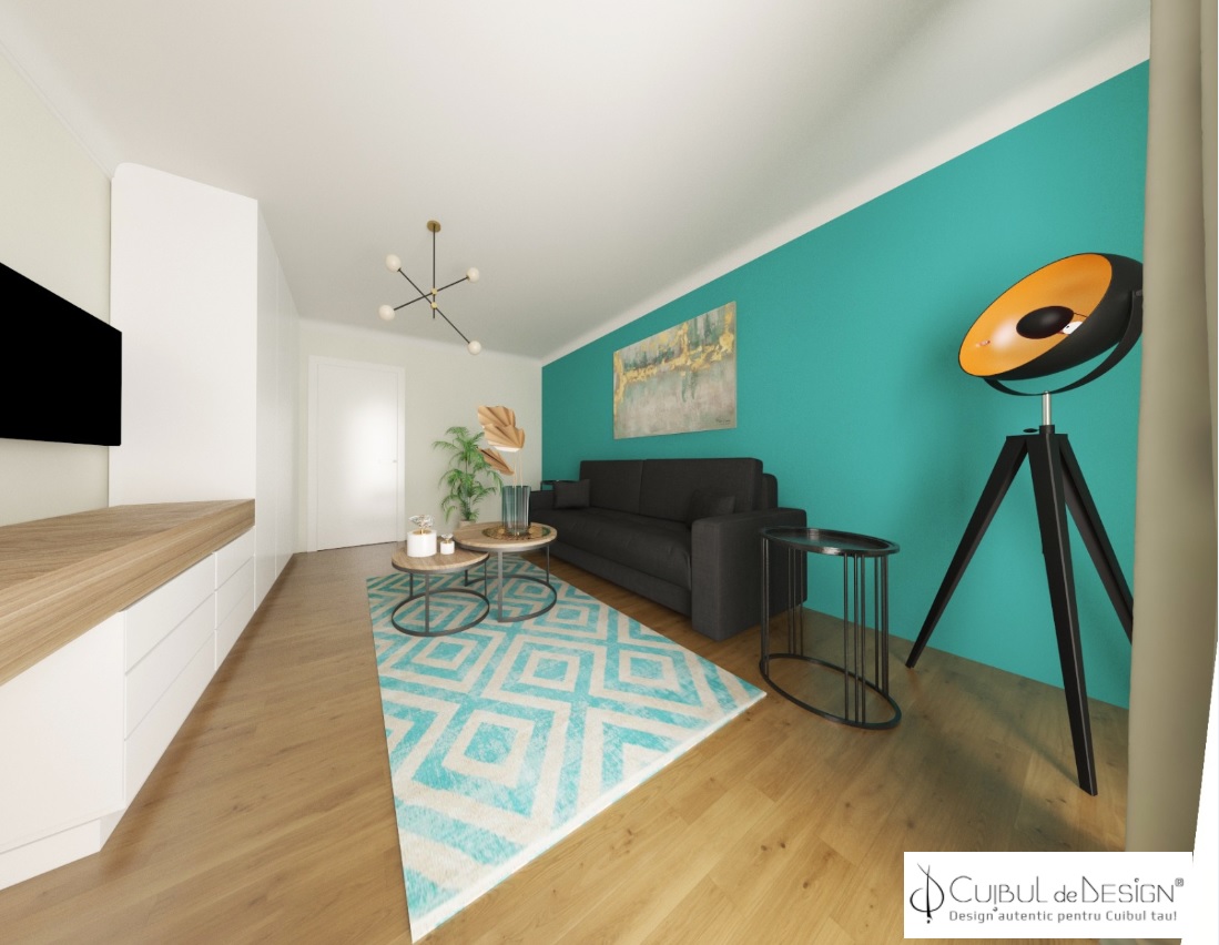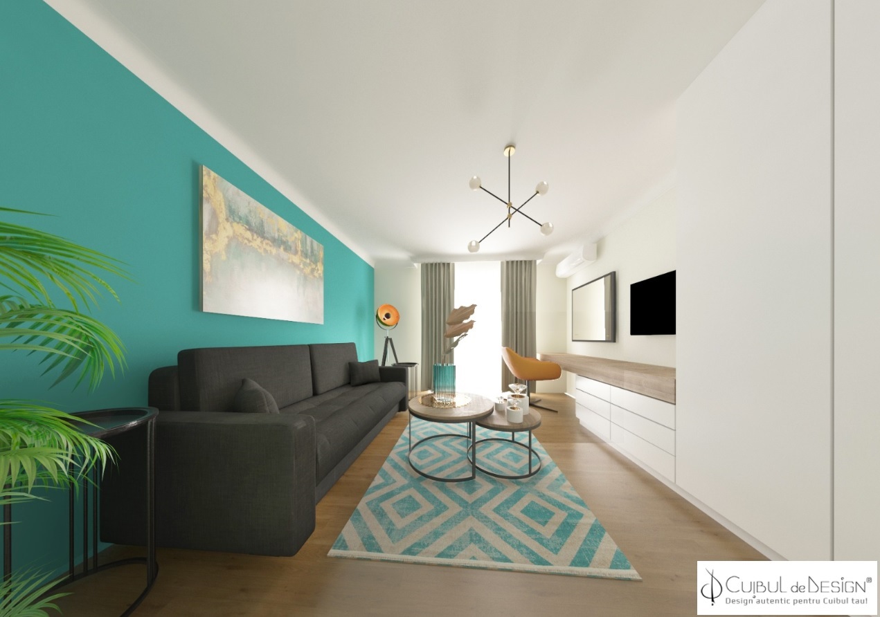 Daca in living am ales o paleta cromatica de nuante pastelate, mai suave, aici am ales ca accent de culoare o nuanta de albastru turquoise. Aceasta se regaseste in lavabila din spatele canapelei si in covor.