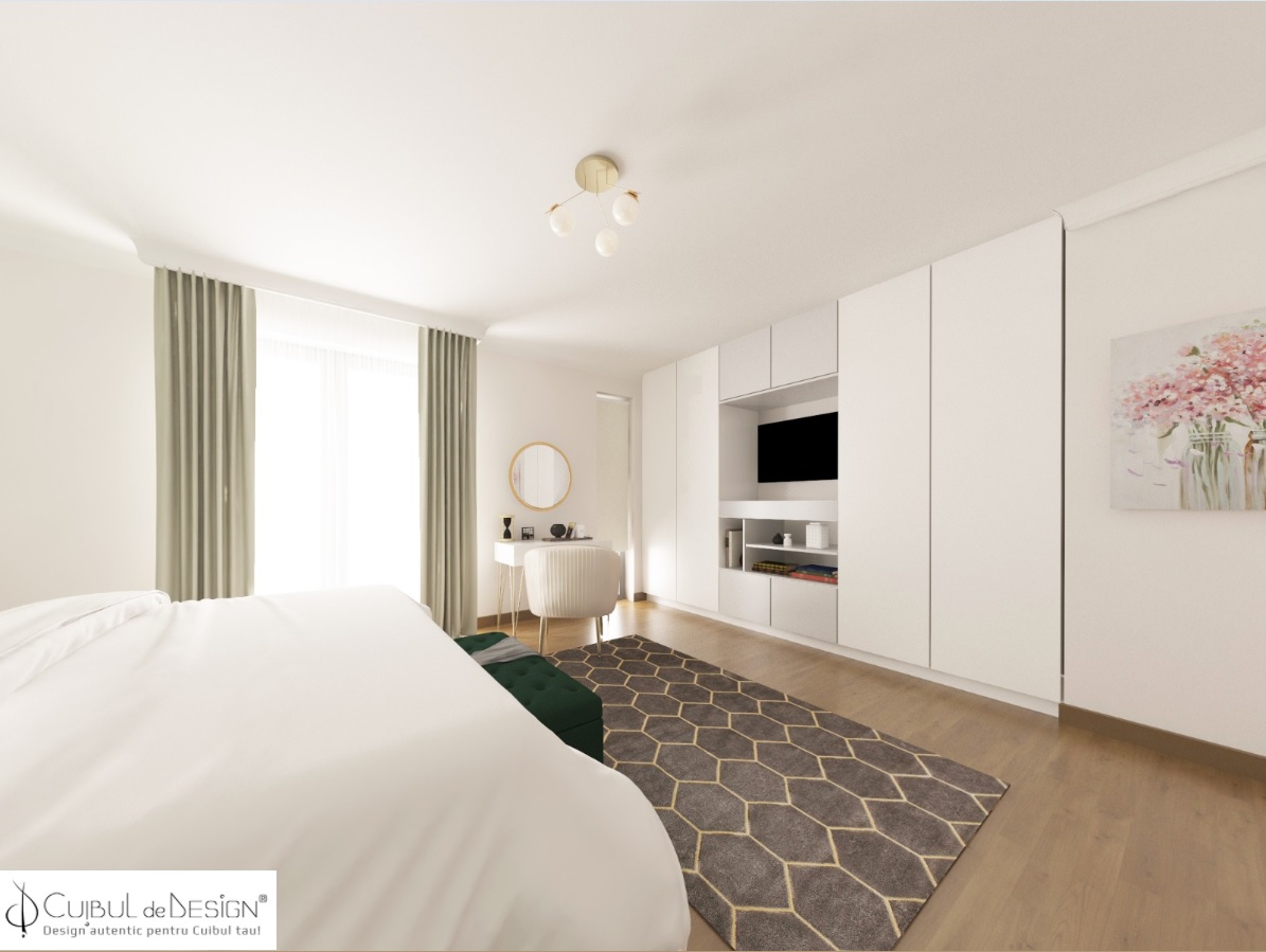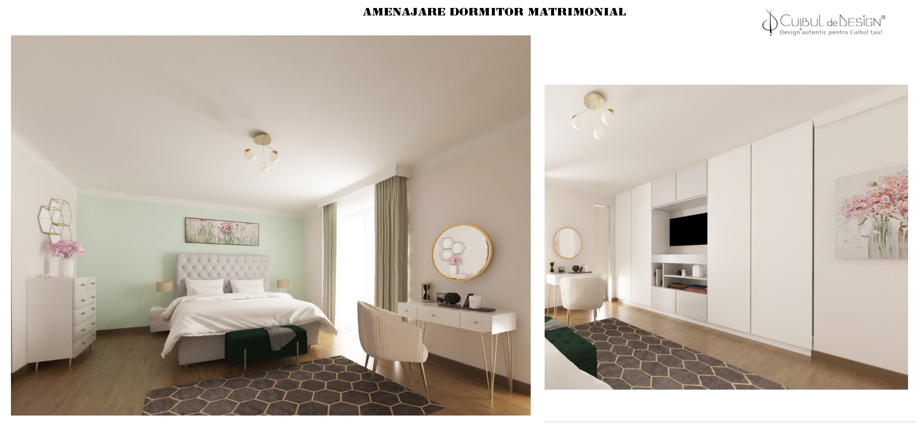 Nuanta de verde aleasa ca accent de culoare evoca asocieri cu natura, aceasta reda o admosfera relaxanta, odihnitoare si armonioasa, ceea ce ne dorim de la un dormitor matrimonial.