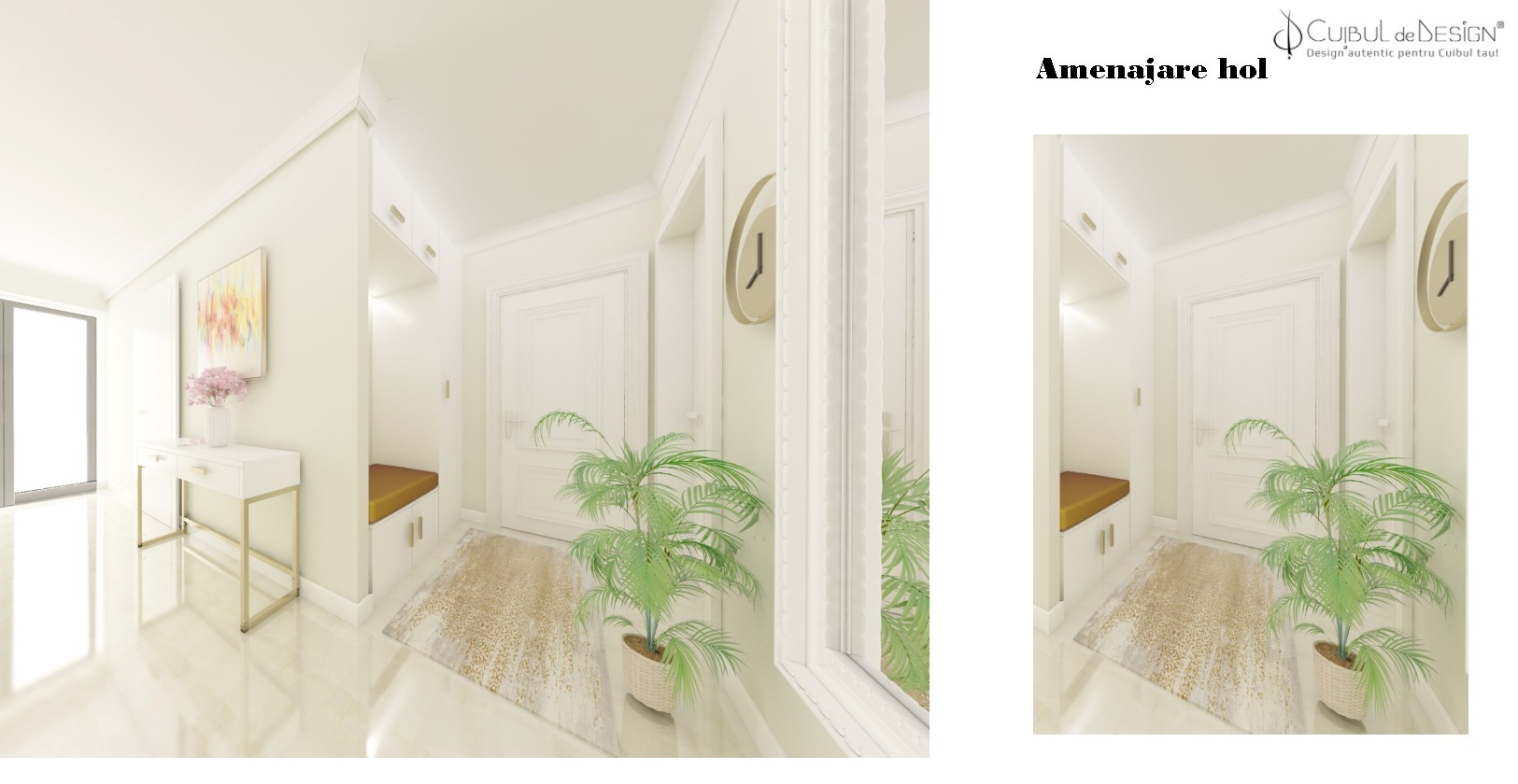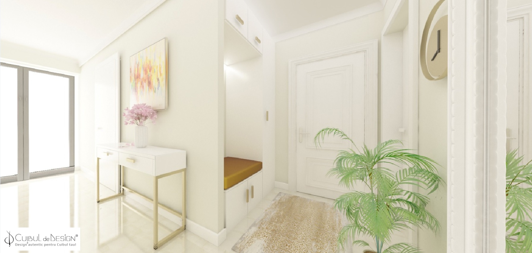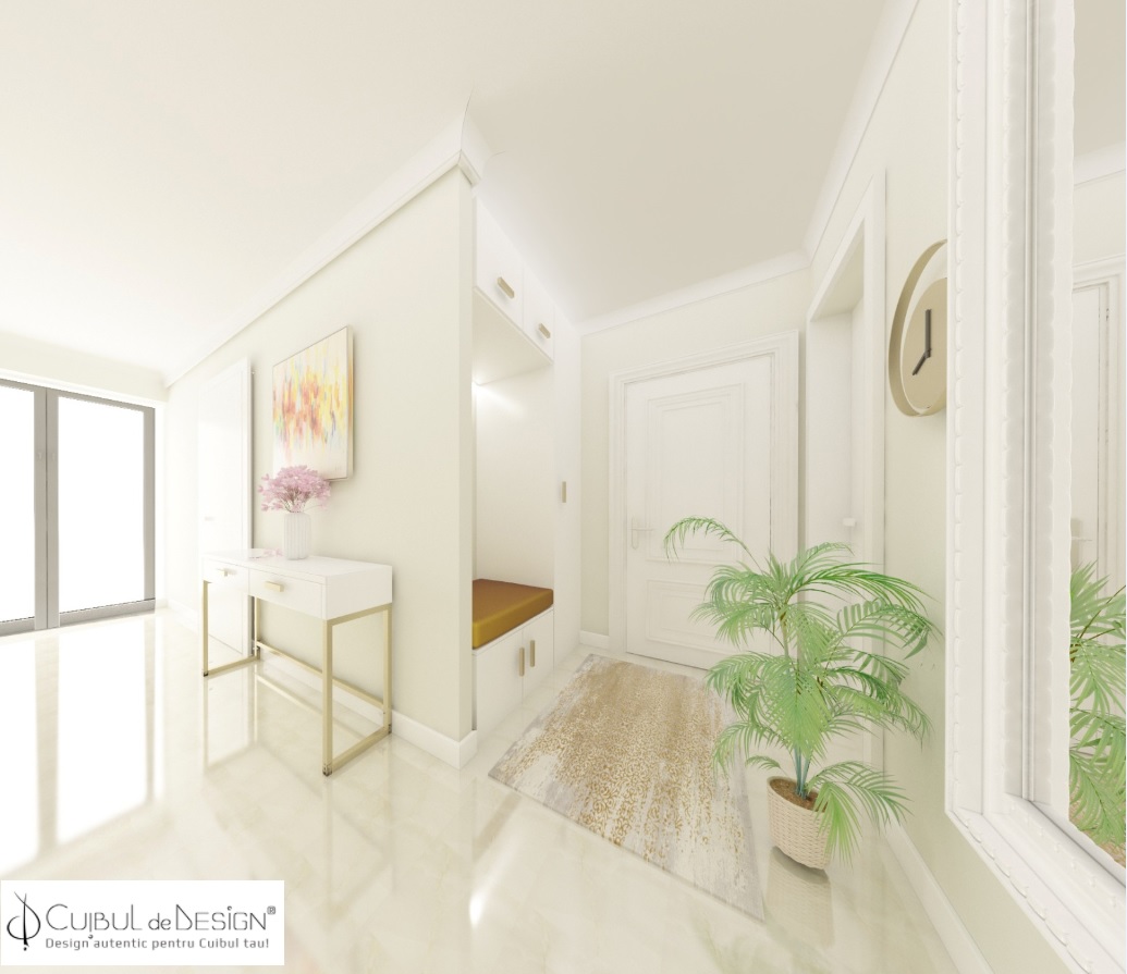 Asa cum am specificat mai sus, am creat un ambient luminos, cu accente romantice pornind inca din holul locuintei. Consola din hol este o piesa de mobilier eleganta si primitoare. Am tinut cont si de partea practica, asa ca, crearea unei nise ne-a permis modularea unui dulap pentru hainele de zi cu zi, care include si o bancheta.