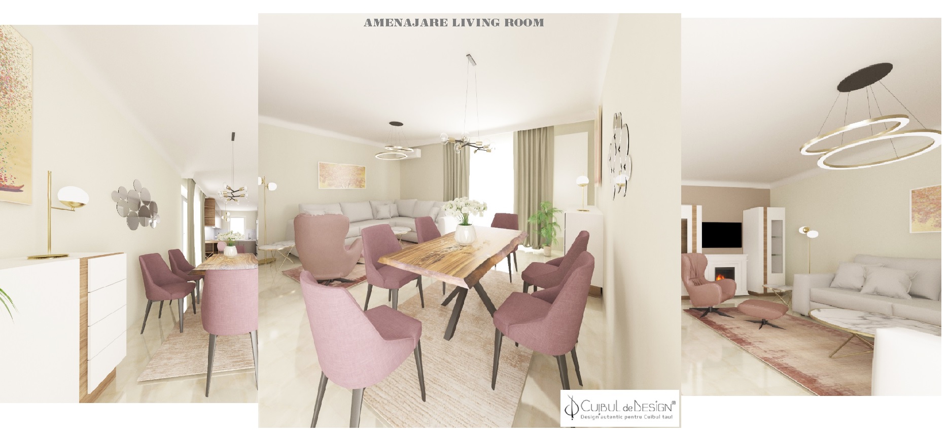 Livingul continua in aceiasi nota eleganta. Astfel, am creat un ambient armonios intre zona de canapea, unde si-a facut prezenta si un semineu, si zona de dining.