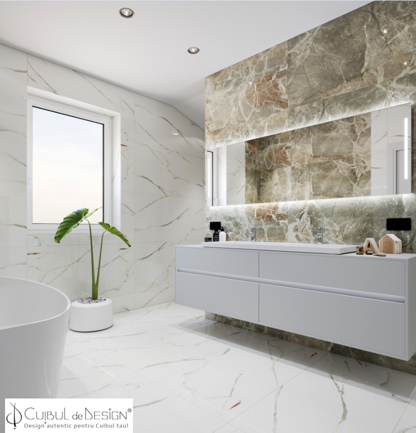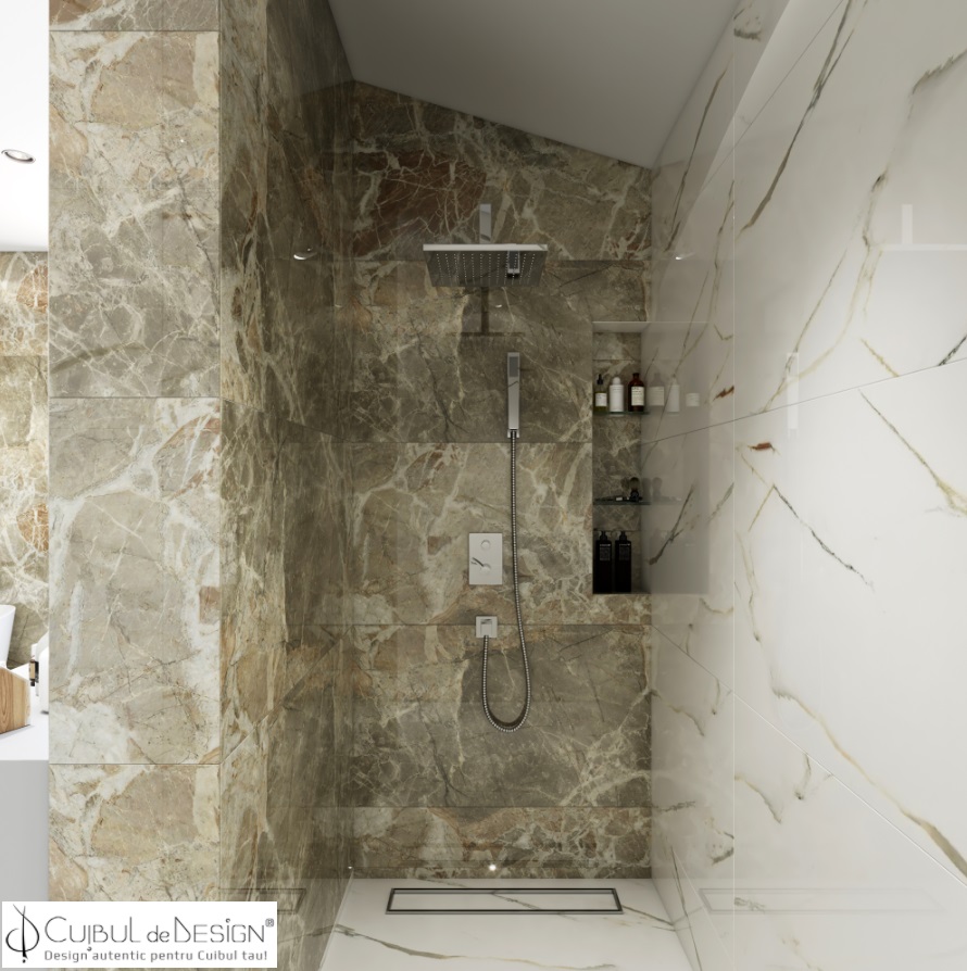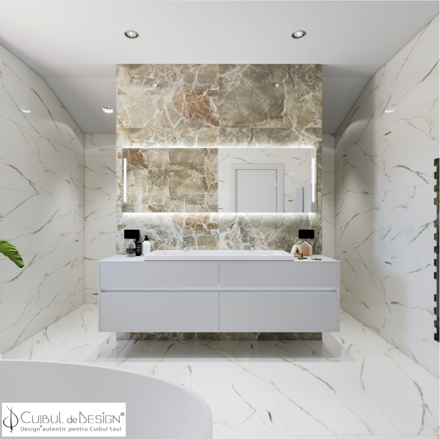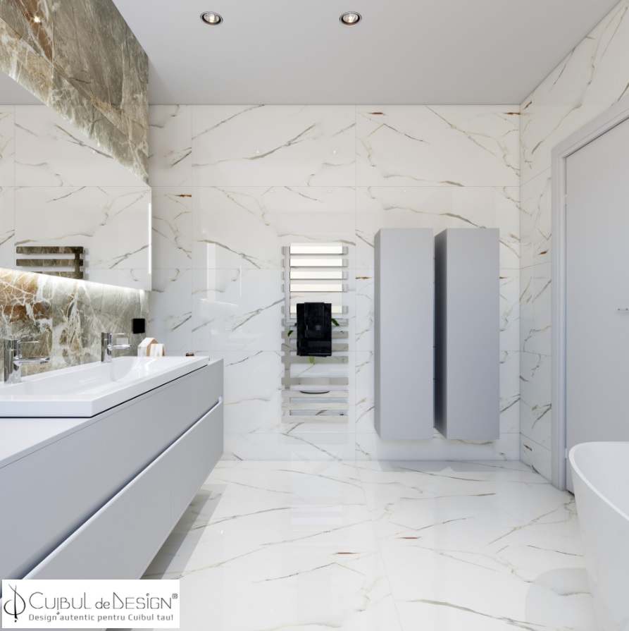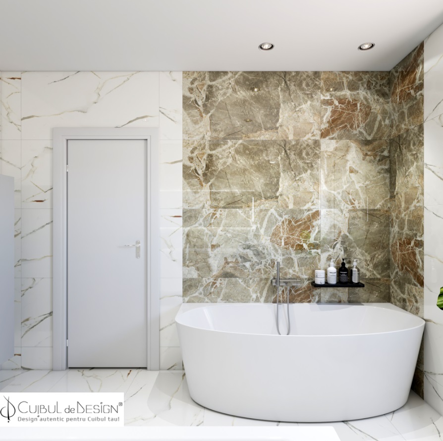 Placile ceramice marmorate sunt in mare trend in amenajarea camerei de baie. Am folosit accente contrastante pentru a evidentia intr-un mod elegant zona cazii si a mobilierului. Obiectele sanitare sunt Design Villeroy & Boch!