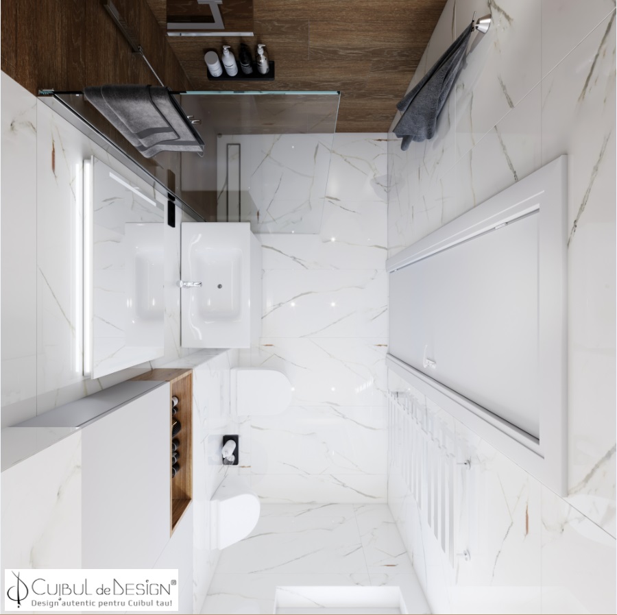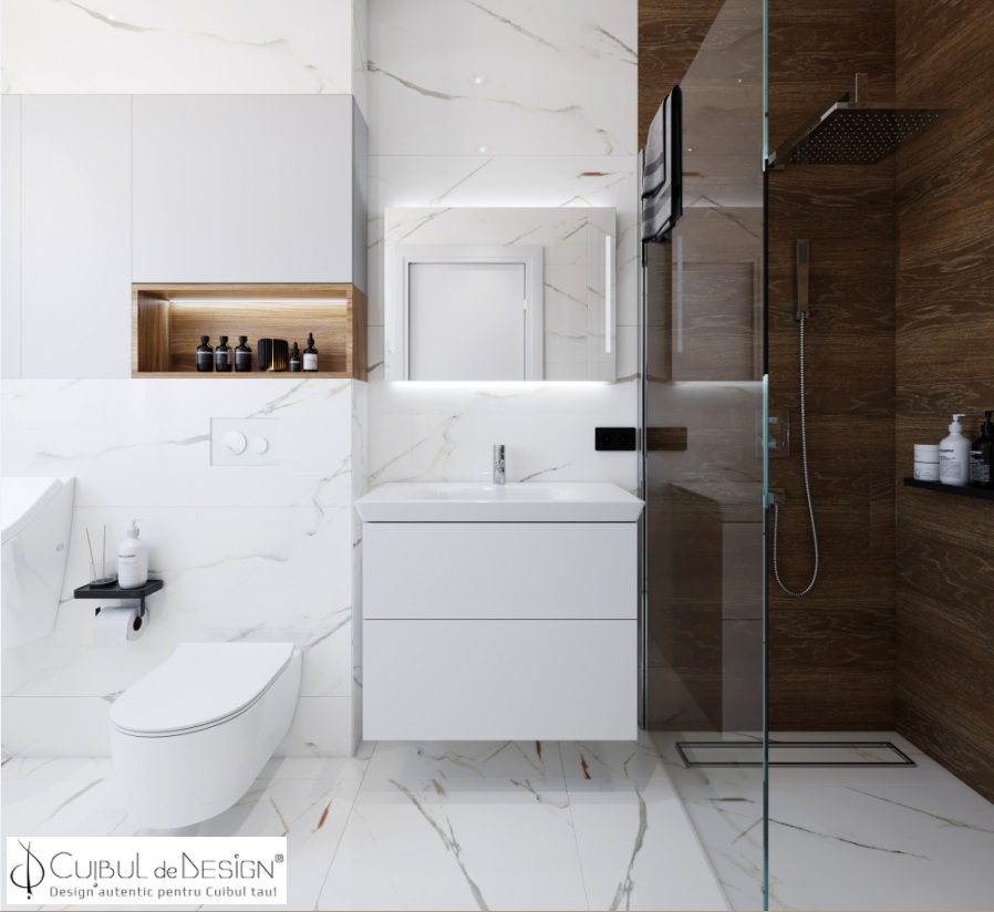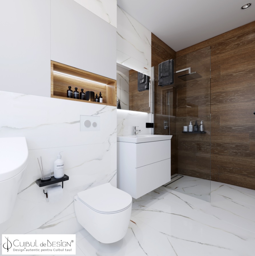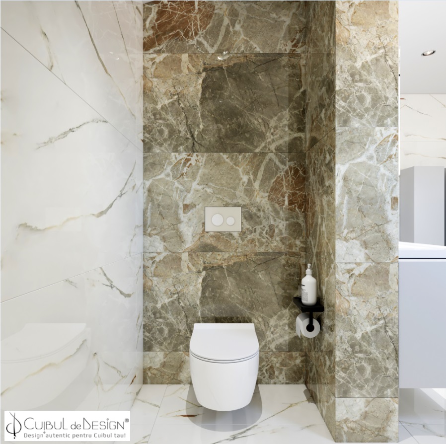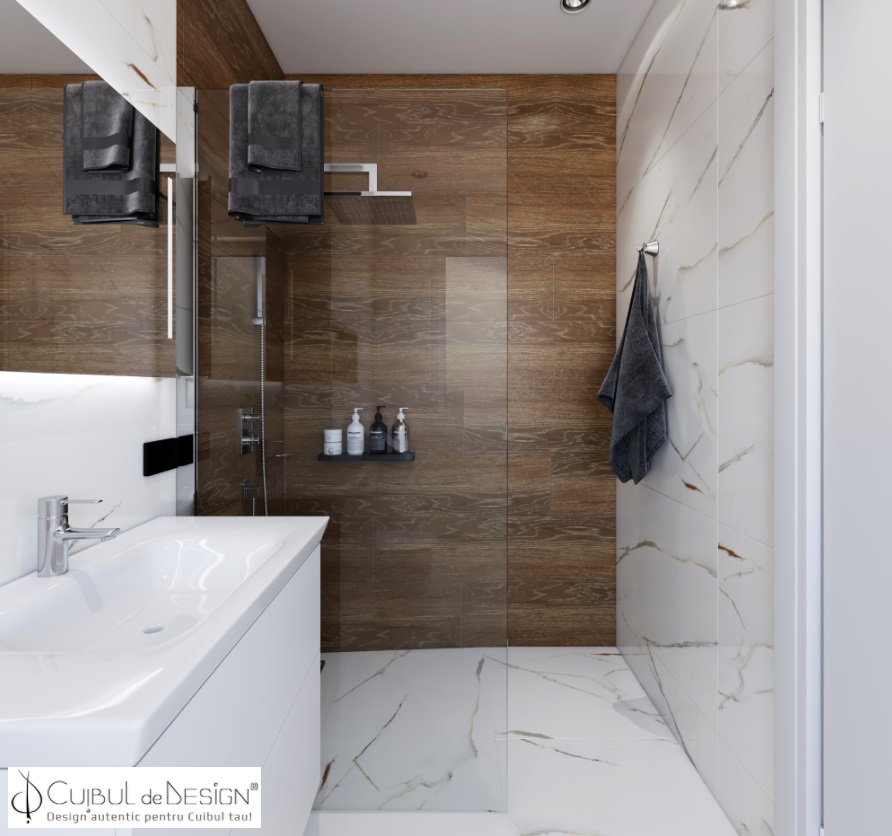 Baia mica sau baia de la parter este finisata cu placi ceramice marmorate de un alb luminos in contrast cu placi ceramice maron, de tip lemn, care incalzesc ambientul.