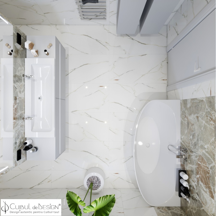 Incheiem povestea amenajarii noastre prin prezentarea baii mari sau baii de la etaj. Avand un spatiu foarte amplu la dispozitie aceasta are toate functiunile de care se poate bucura intreaga familie.