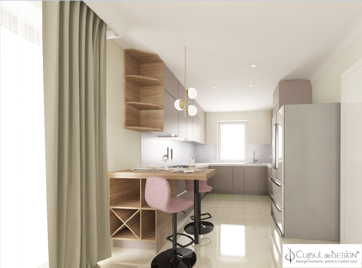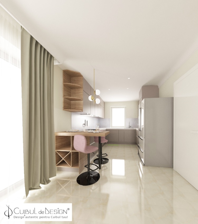 Bucataria este modulata in forma de ‘U’ si se „inchide” spre zona de dining cu o latura de tip bar pentru micul dejun.