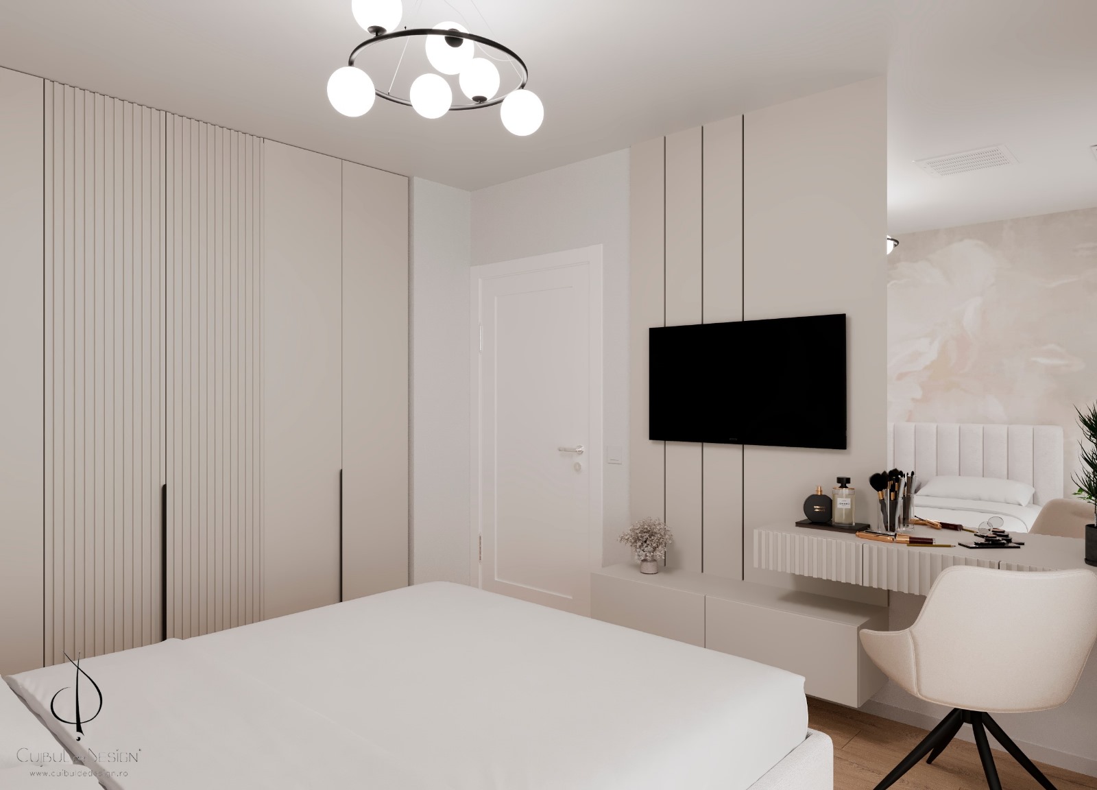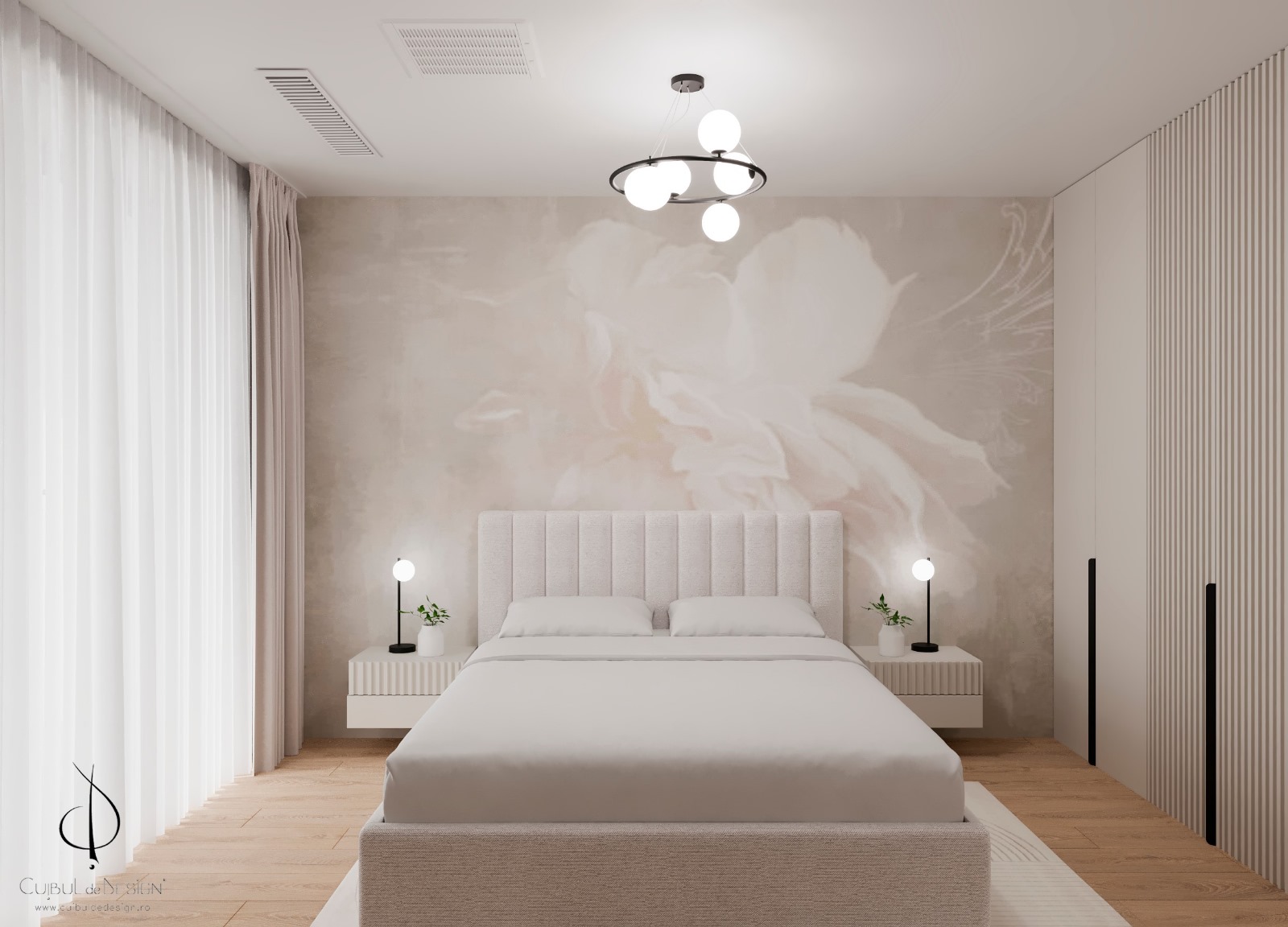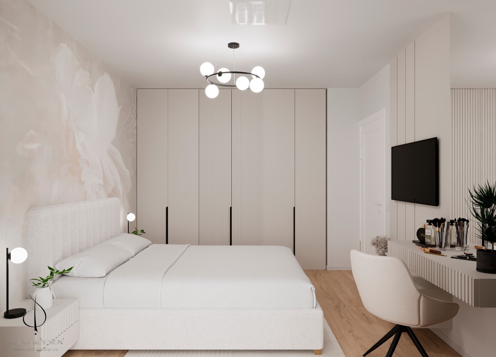 Dormitorul este un spațiu elegant, luminos și funcțional. Am păstrat cromatica unitară a livingului – soft și luminoasă – pentru a crea continuitate și armonie între zonele apartamentului.