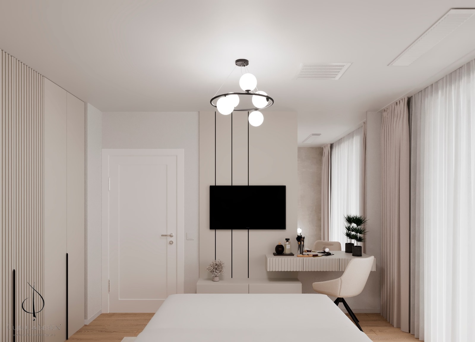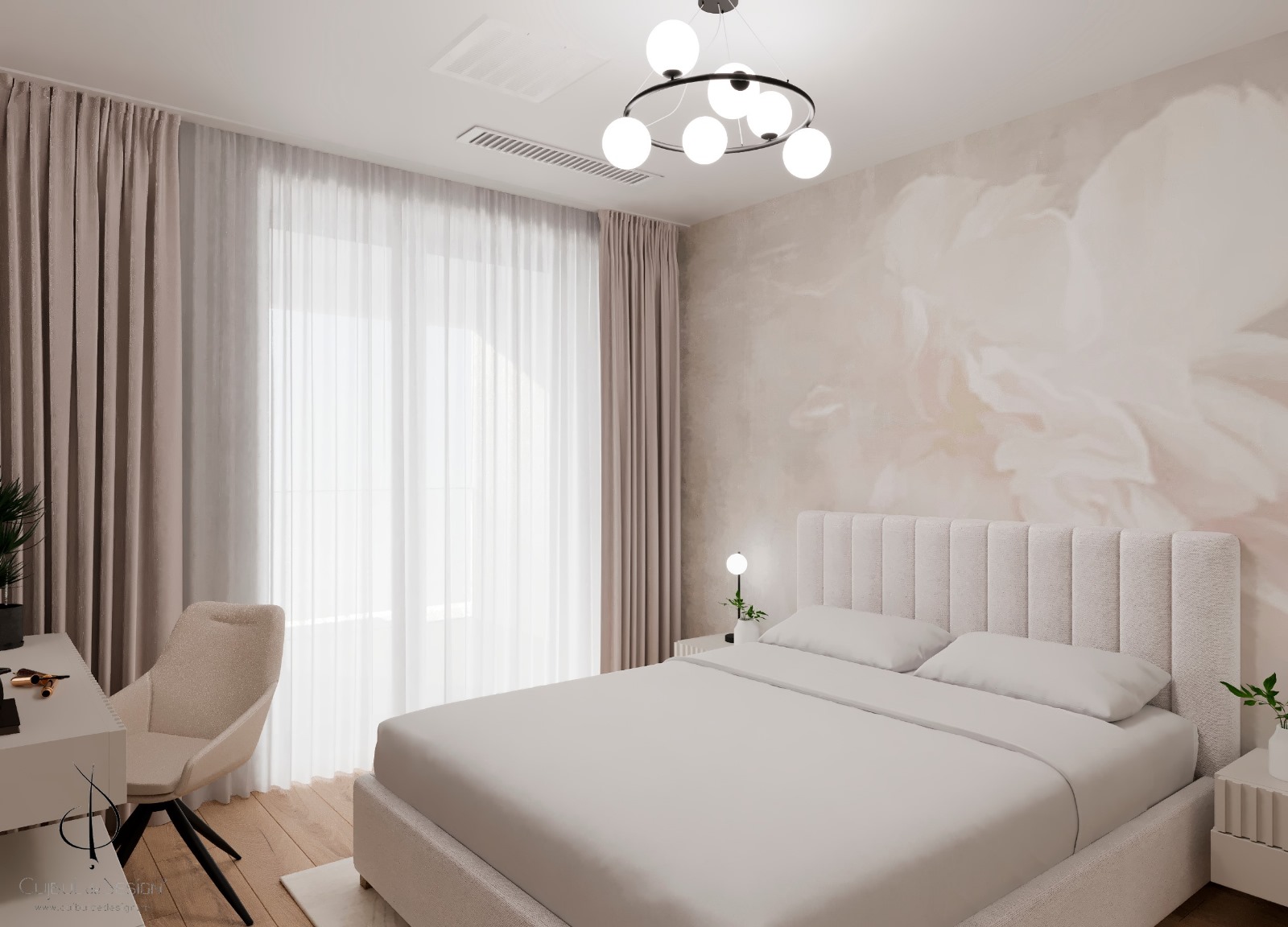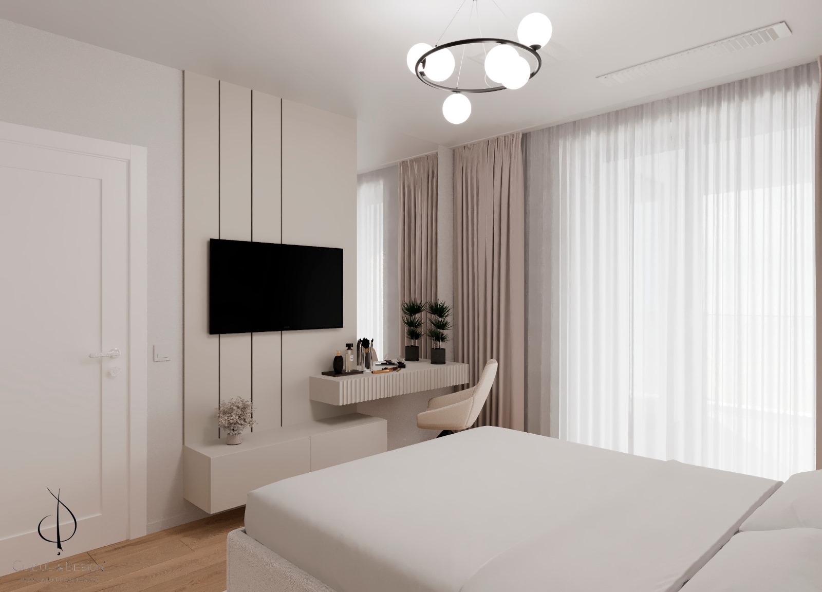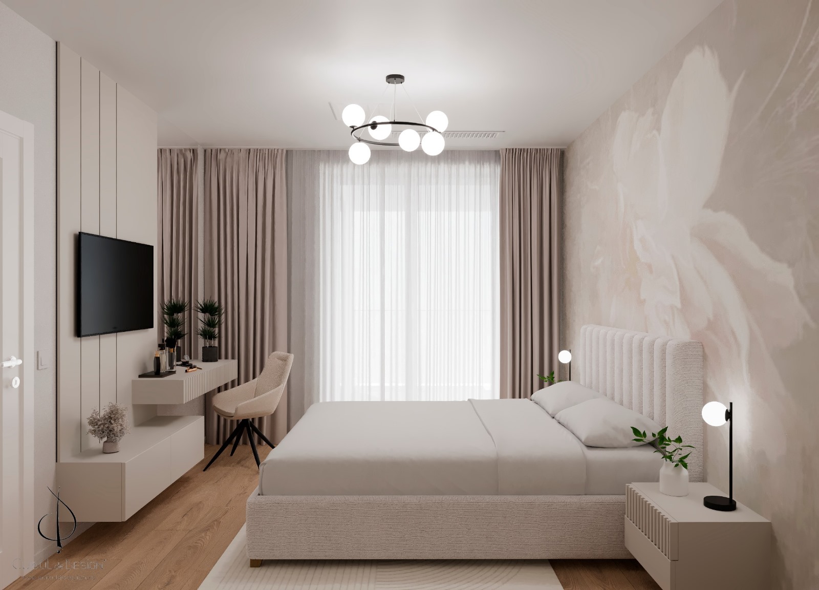 Dormitorul este un spațiu elegant, luminos și funcțional. Am păstrat cromatica unitară a livingului – soft și luminoasă – pentru a crea continuitate și armonie între zonele apartamentului.