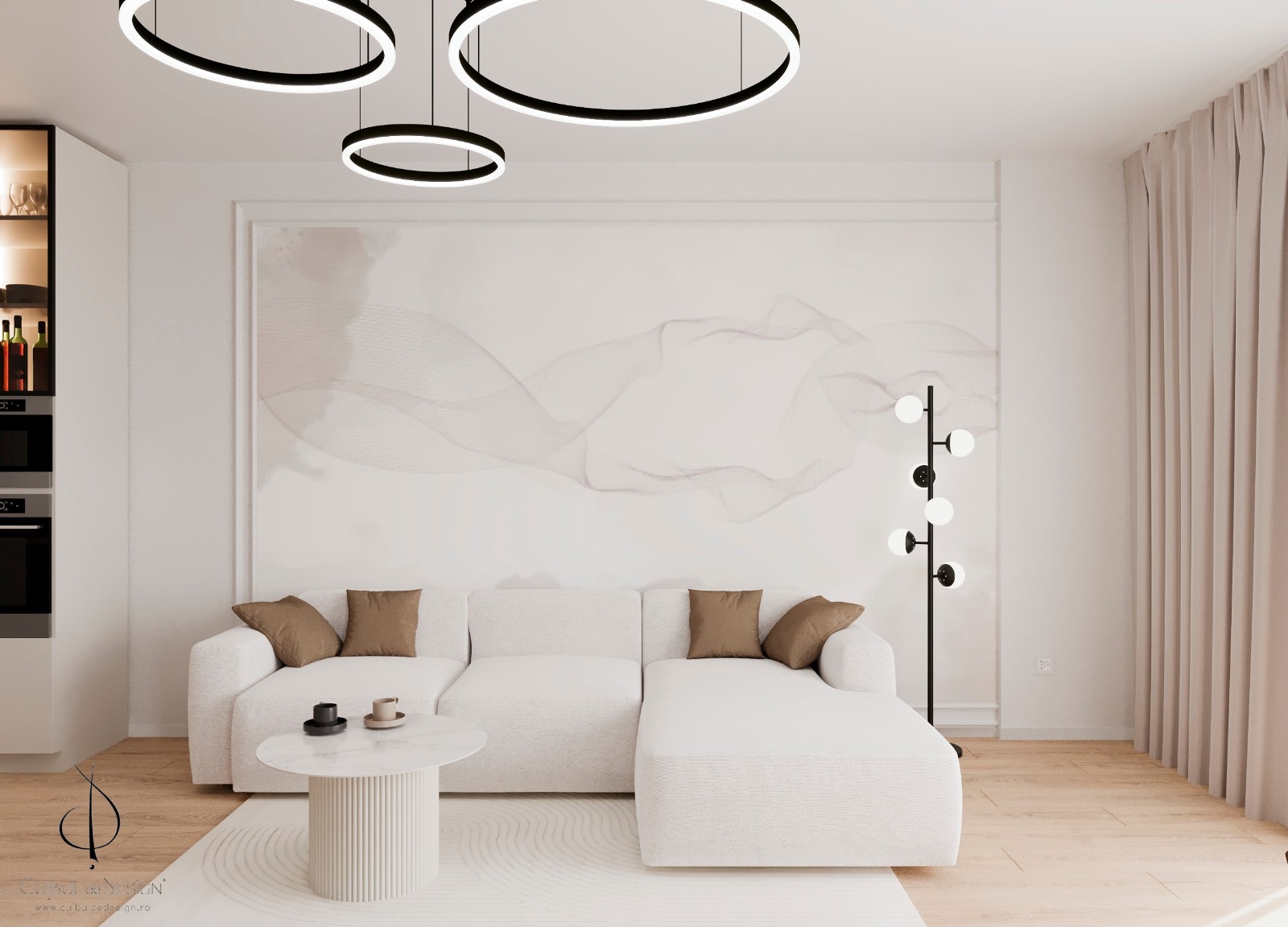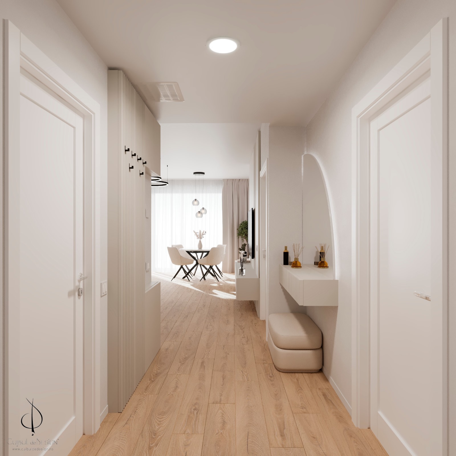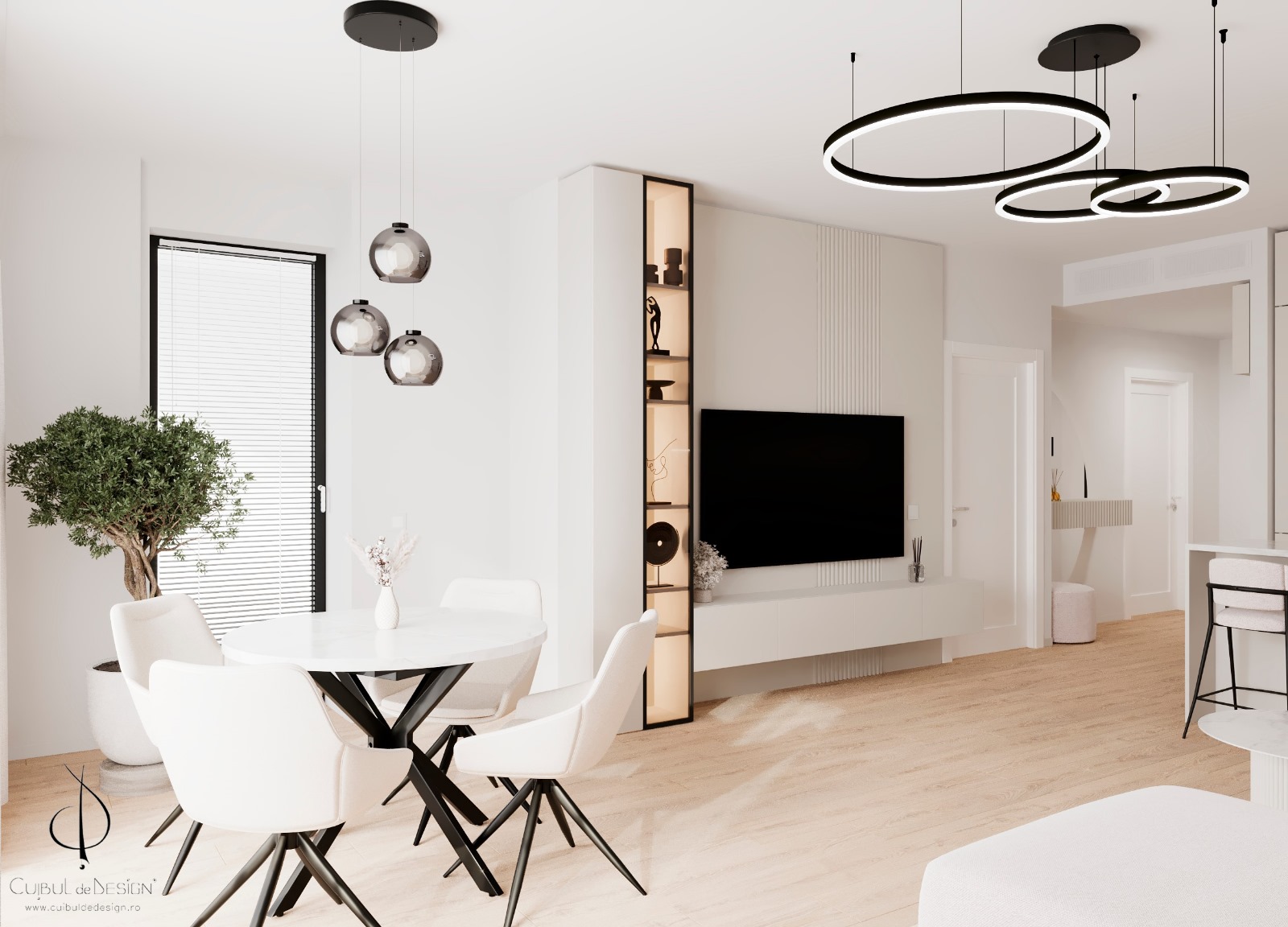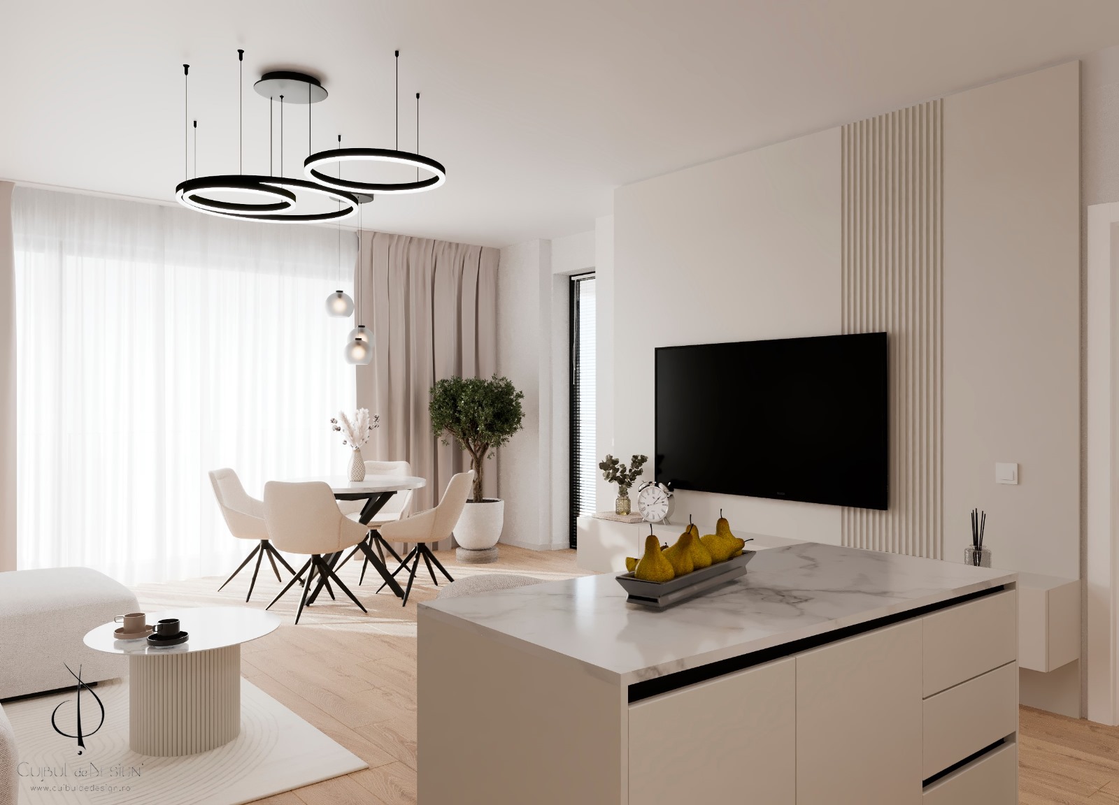 Intregul apartament poartă un aer minimalist, unde simplitatea formelor și unitatea cromatică definesc o estetică rafinată și echilibrată. Liniile curate și detaliile discrete compun un spațiu ce inspiră calm și ordine, fără a fi rece sau impersonal. În spatele acestei aparente simplități se află însă o muncă atentă, un proces creativ bazat pe dialog și încredere. Colaborarea armonioasă dintre designer și beneficiară a fost cheia prin care fiecare detaliu și-a găsit locul firesc, transformând proiectul într-o reflecție autentică a echilibrului dintre funcționalitate, estetică și personalitate.