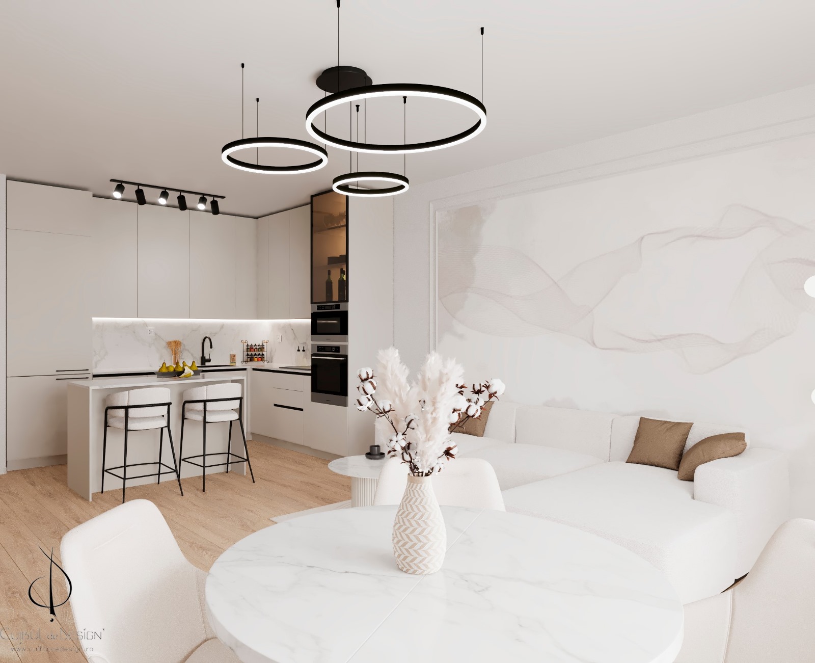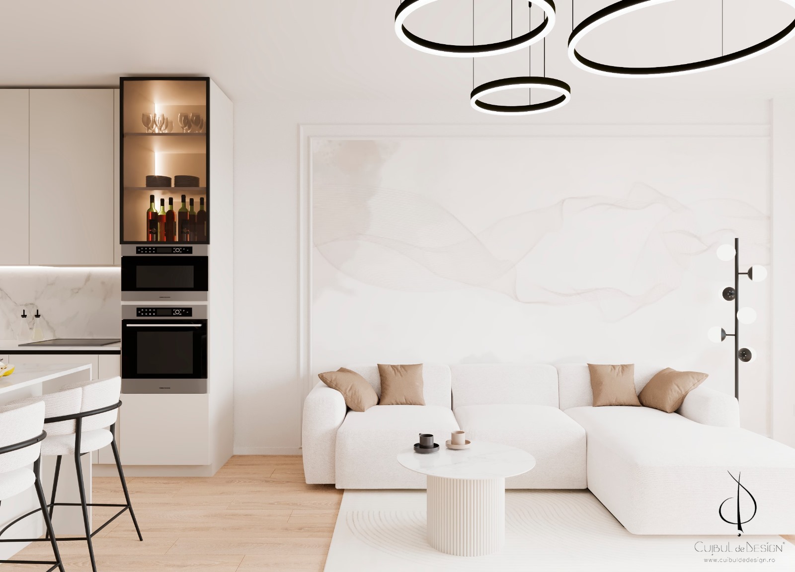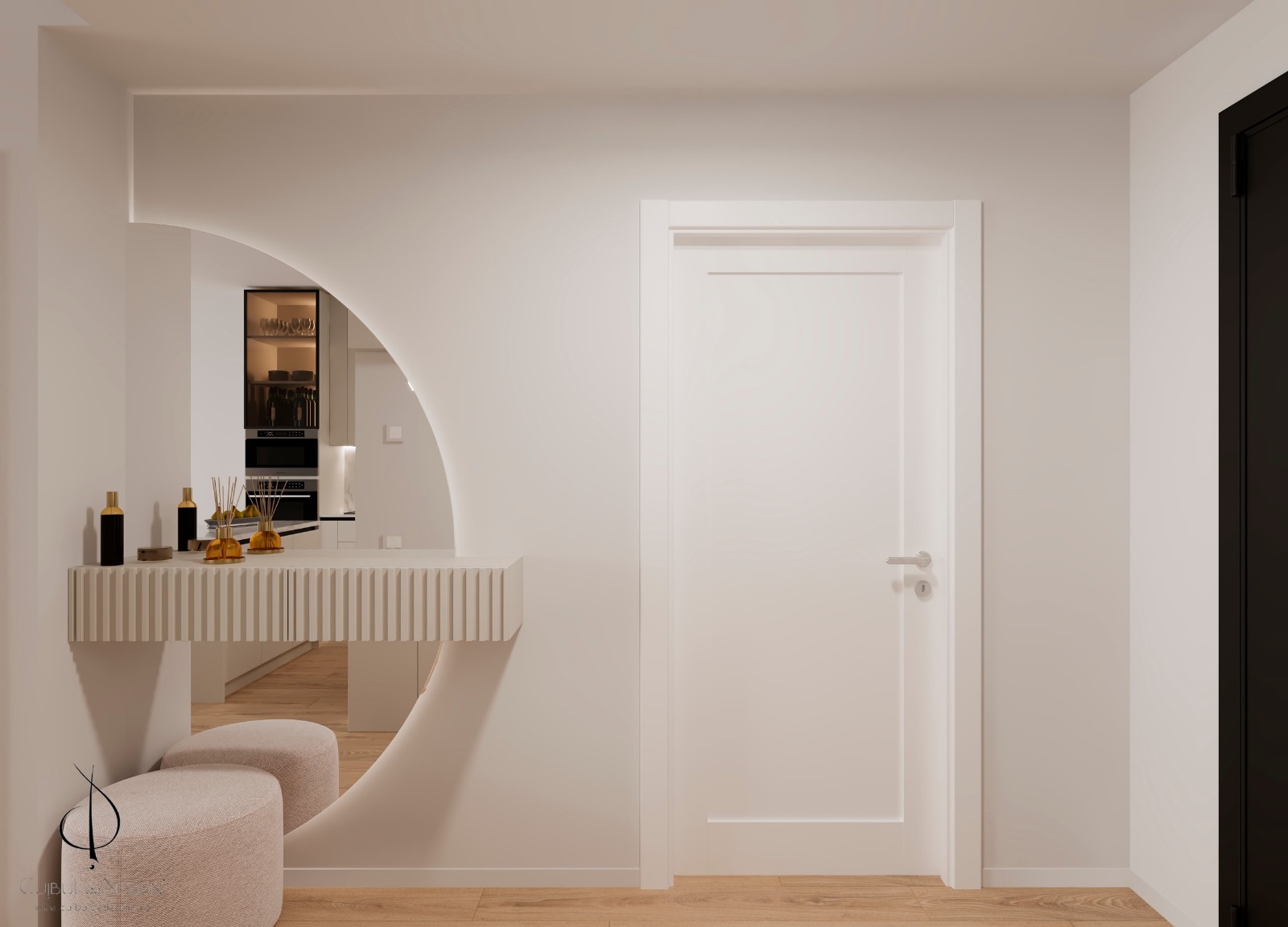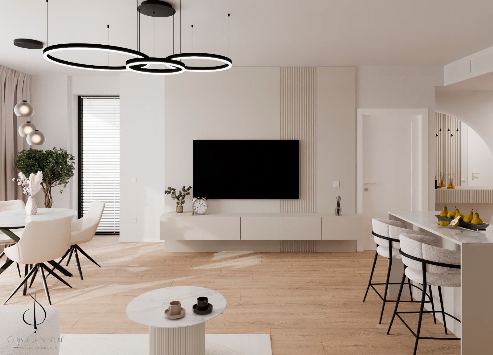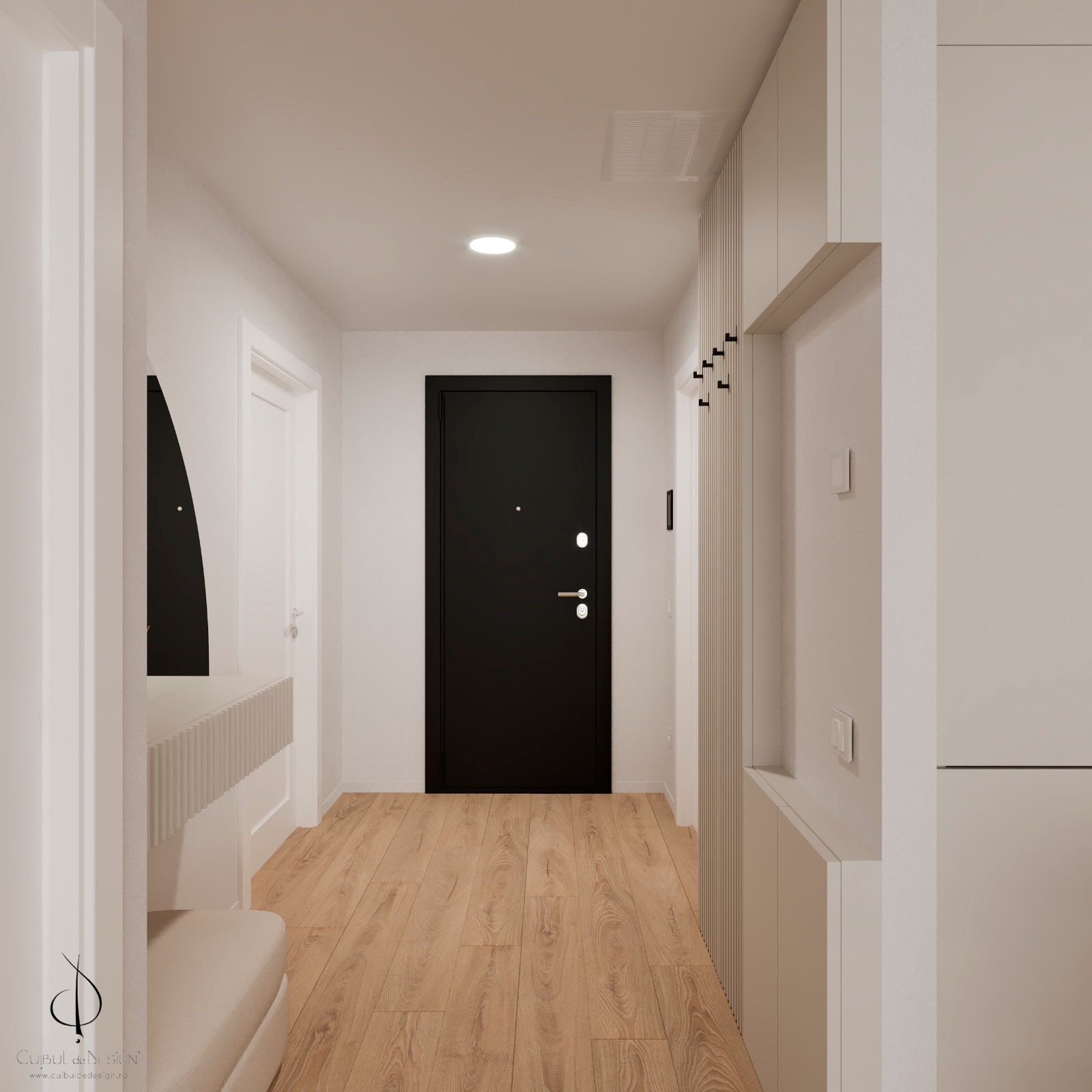 Intregul apartament poartă un aer minimalist, unde simplitatea formelor și unitatea cromatică definesc o estetică rafinată și echilibrată. Liniile curate și detaliile discrete compun un spațiu ce inspiră calm și ordine, fără a fi rece sau impersonal. În spatele acestei aparente simplități se află însă o muncă atentă, un proces creativ bazat pe dialog și încredere. Colaborarea armonioasă dintre designer și beneficiară a fost cheia prin care fiecare detaliu și-a găsit locul firesc, transformând proiectul într-o reflecție autentică a echilibrului dintre funcționalitate, estetică și personalitate.