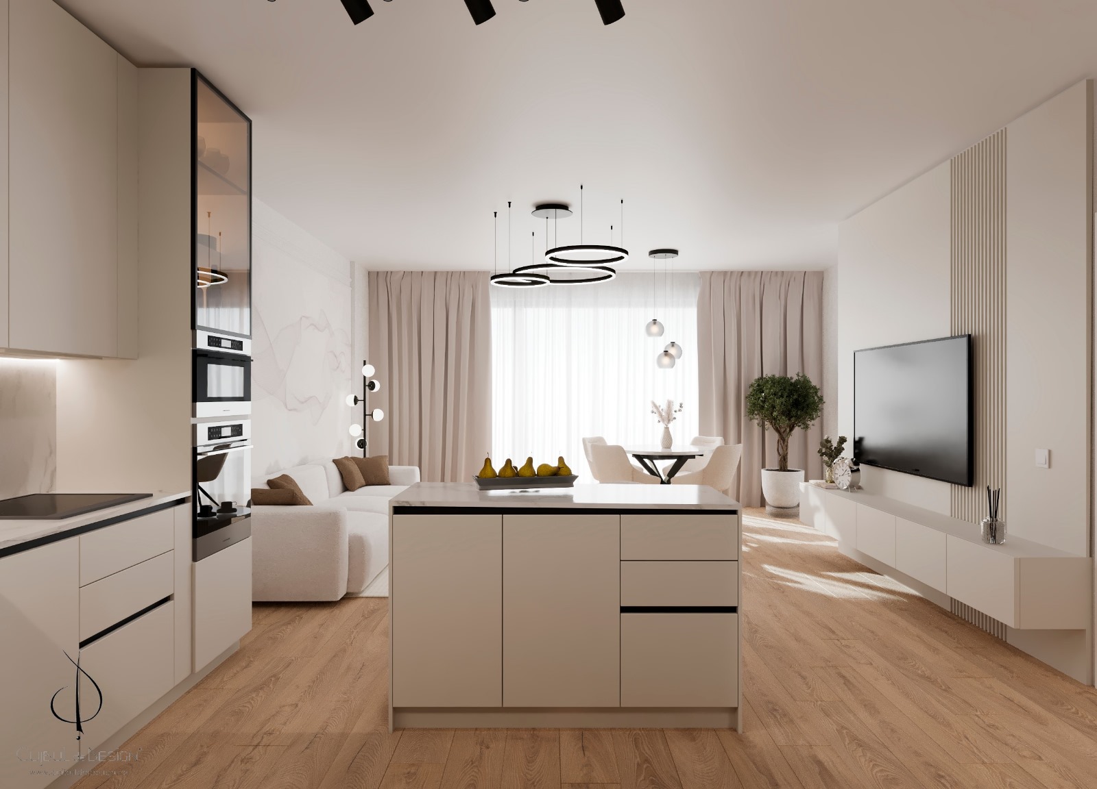 In acest proiect, am dorit ca bucătăria și livingul să comunice firesc, într-un dialog cromatic și funcțional care transformă spațiul într-un întreg coerent. Nu am privit bucătăria ca pe un spațiu separat, ci ca pe o parte integrantă a unei povești vizuale continue. Paleta cromatică a fost gândită astfel încât nuanțele să curgă lin dintr-o zonă în alta, creând o armonie calmă, echilibrată și elegantă.
