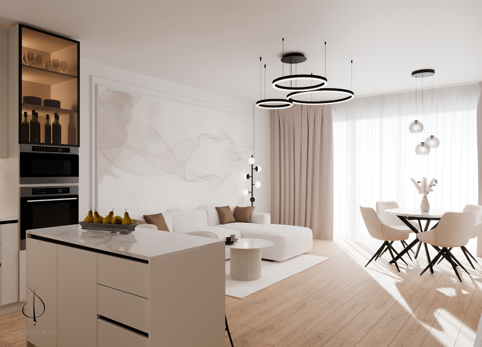 Lumina naturală a fost un element pe care am dorit să-l păstrăm și să-l valorificăm în amenajare. Ea inundă spațiul și îi conferă o strălucire blândă, punând în valoare textura materialelor și subtilitatea tonurilor. Astfel, întreaga zonă de zi respiră luminozitate, echilibru și armonie — un loc unde funcționalul se împletește cu esteticul, iar fiecare detaliu contribuie la povestea de acasă.