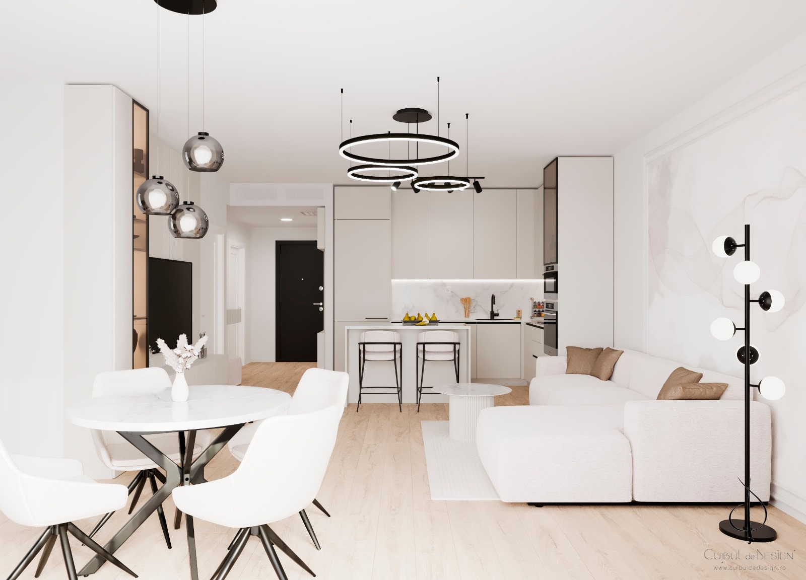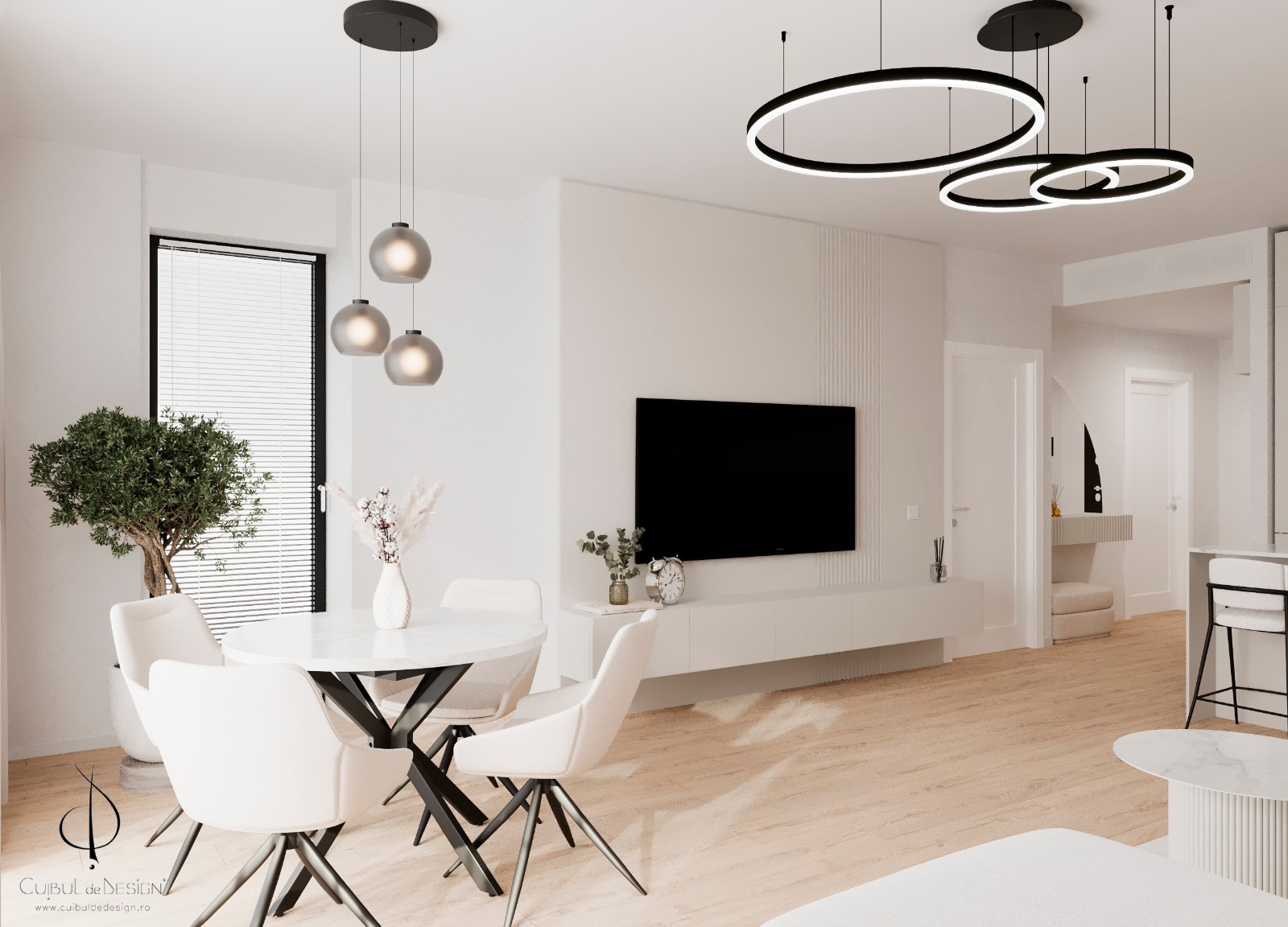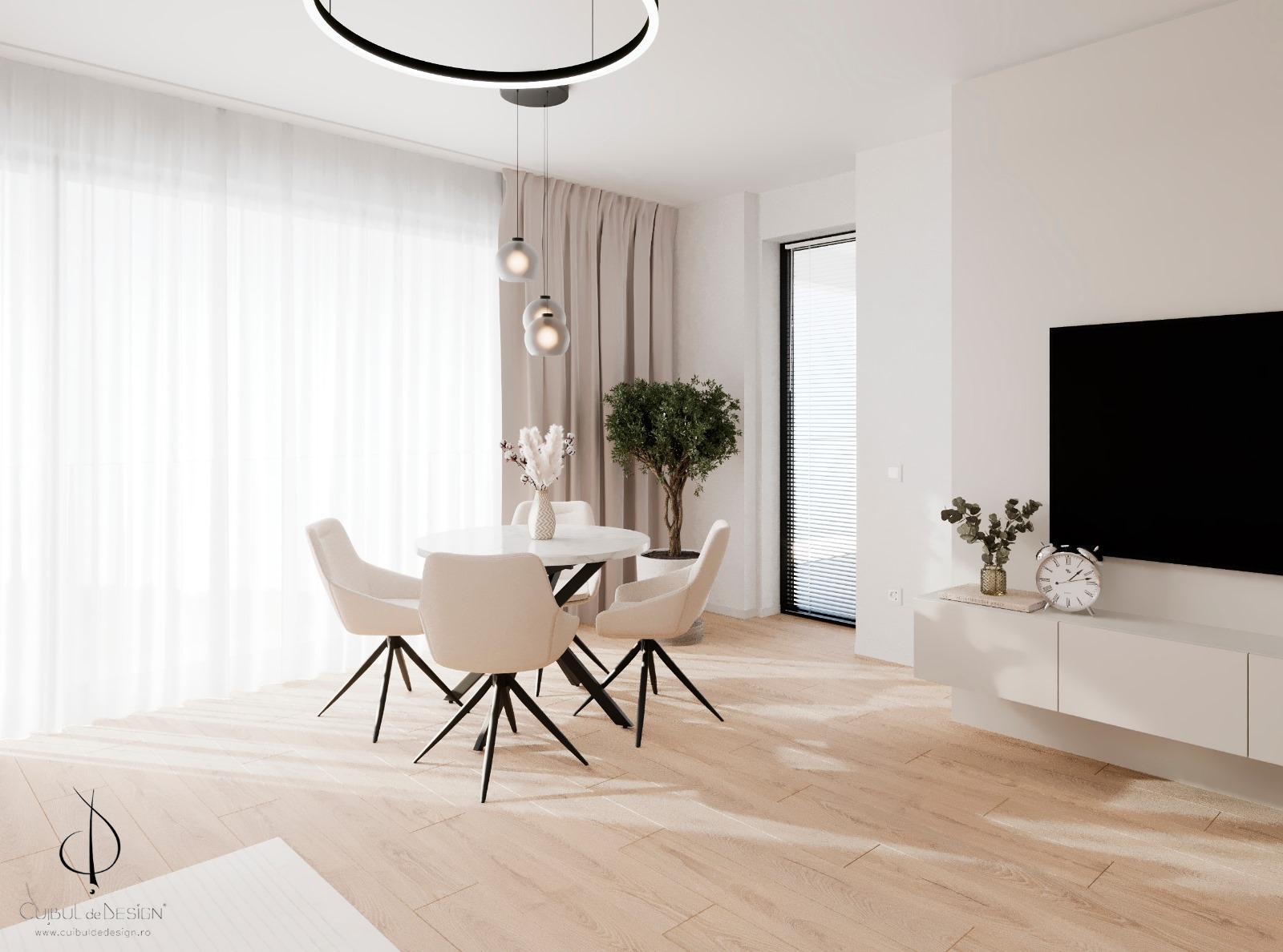 Beneficiara și-a dorit un stil minimalist, iar împreună am reușit să transpunem această dorință în realitate. Am păstrat o cromatică fină, uniformă, pusă în valoare de lumina naturală generoasă. Rezultatul este un spațiu funcțional, aerisit și echilibrat, în care fiecare zonă își păstrează rolul fără a încărca atmosfera.