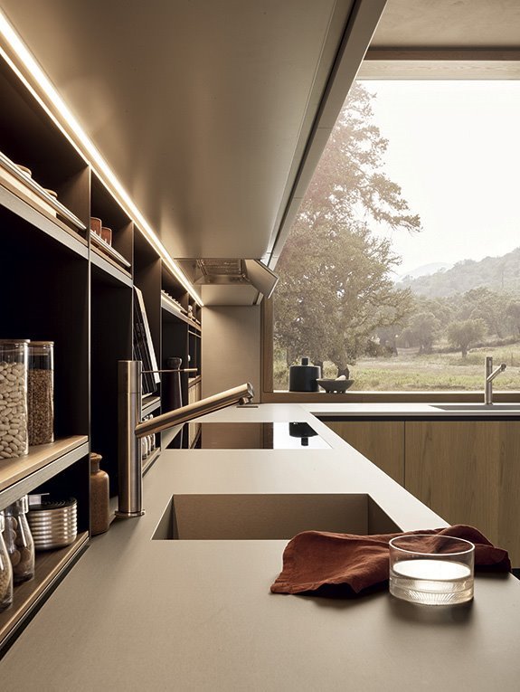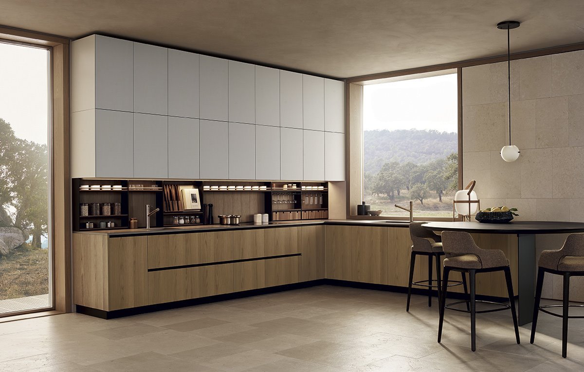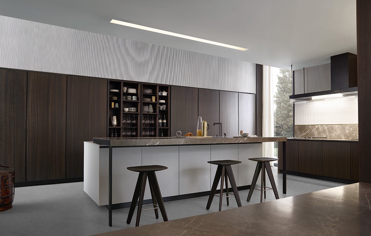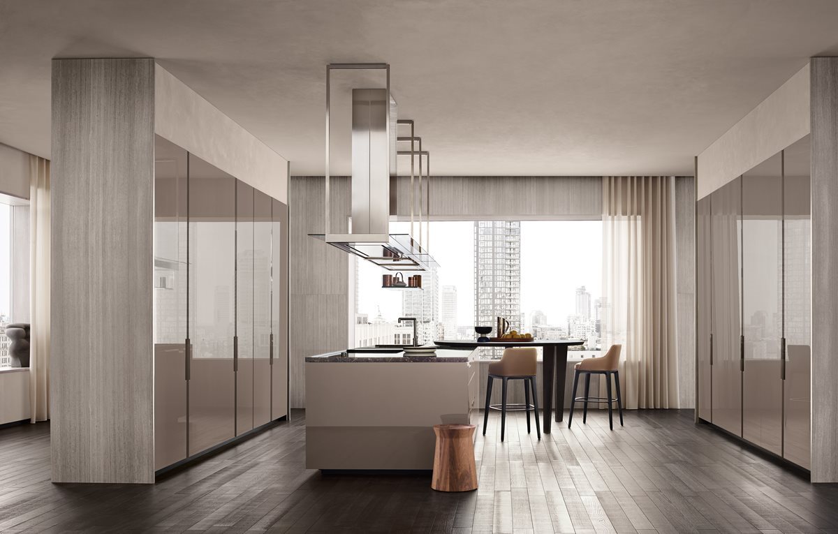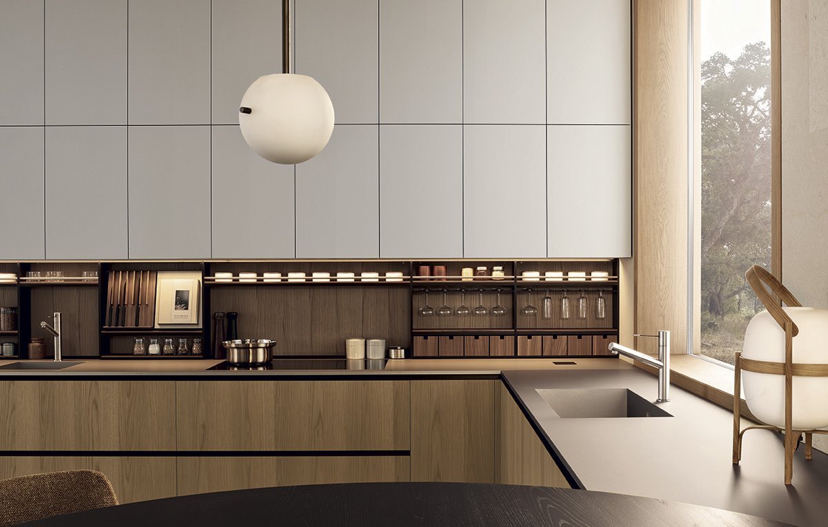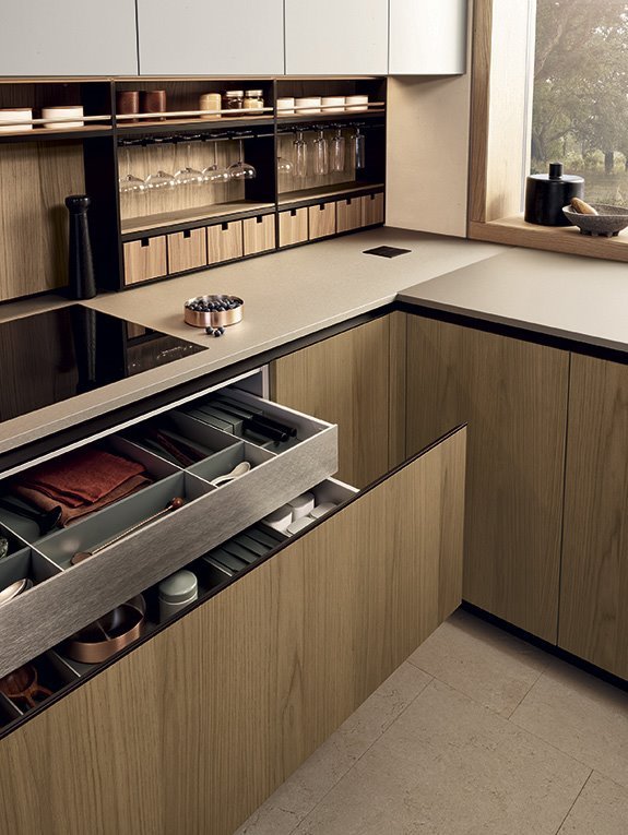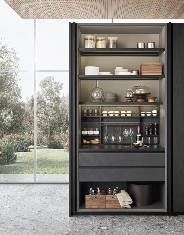 Un rol important il au si coloanele de depozitare. Acestea se pot integra cu usurinta in compozitia bucatariei si confera un spatiu mult mai generos depozitarii. Un ansamblu de coloane poate ascunde atat frigiderul incorporat, poate integra cuptoarele, sertarele termice si expresorul intr-o linie de design minimalista si practica.