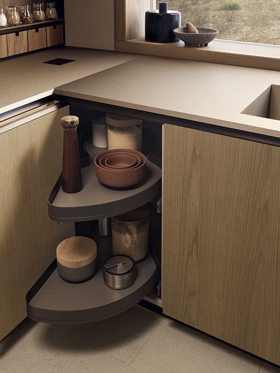 In cazul colturilor accesorizarea acestora cu rafturi speciale nu trebuie evitata. Aceste rafturi glisante in afara spatiului mobilierului ne permit accesarea cu usurinta a veseli depozitate.