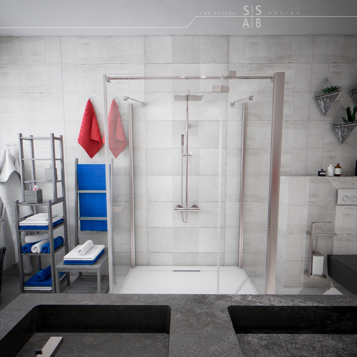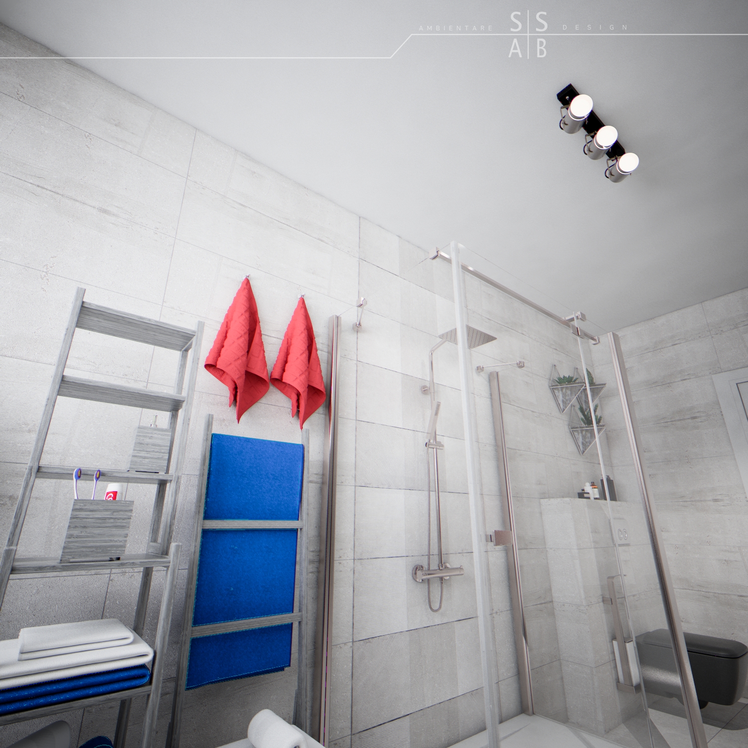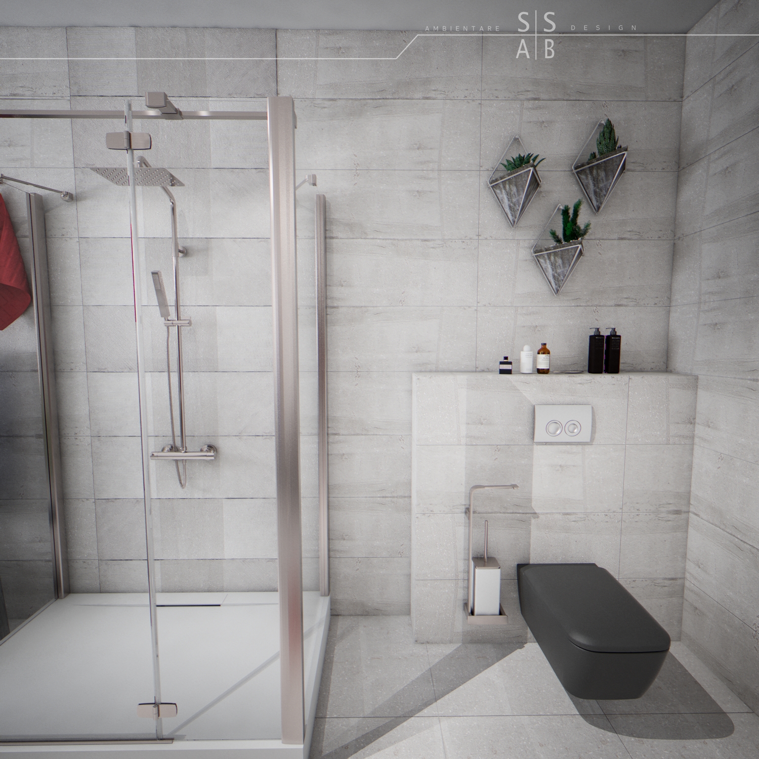 Pentru baia baietilor, am optat pentru o cromatica alcatuita din nuante de gri, acestea redand un efect masculin.