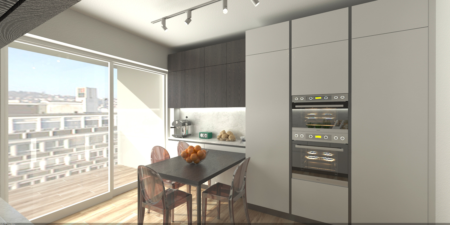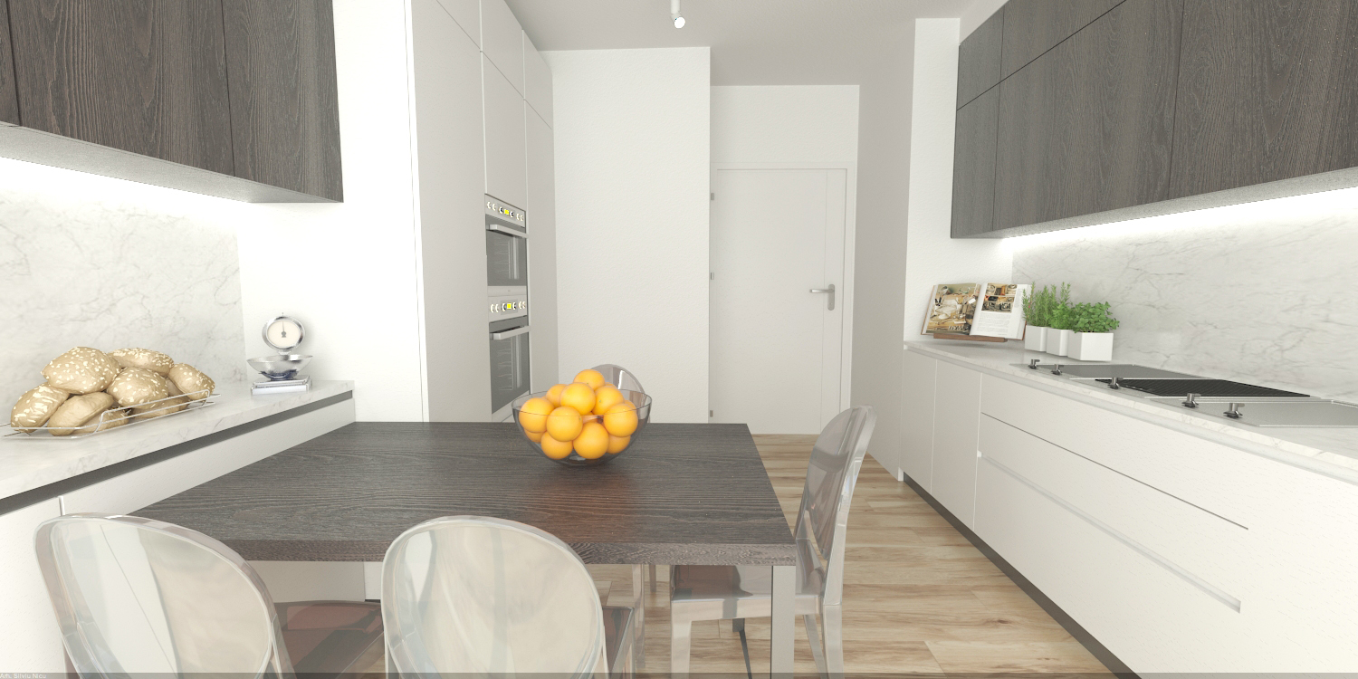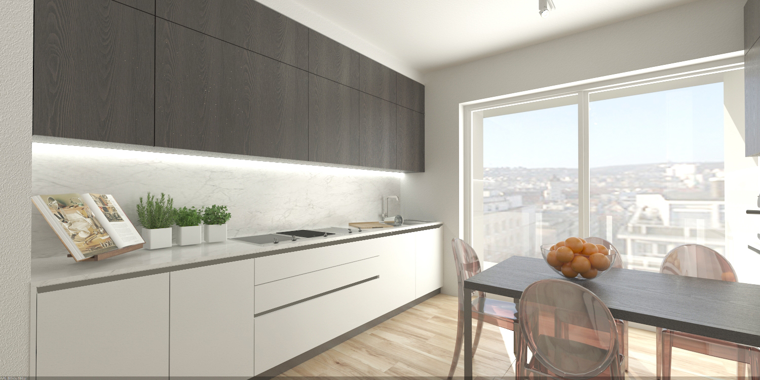 O bucatarie este un laborator de cercetare și, de asemenea, un loc pentru suflet. Are nevoie de o organizare riguroasa, dar și de convivialitate. Ratiunea si emotia își au locul în bucatarie și în inima oamenilor care ii aduc viata. Furnizorul italian de bucatraii Cesar a pus oamenii în centrul proiectelor sale iar modelul Maxima cu linii fine si riguroase s-a integrat de minune proiectului nostru. Compozitia bucatariei a fost conceputa cat mai curat fiind utilata cu toata aparatura moderna de ultima generatie a brandului Miele. Finisajul de lemn maro in combinatie cu albul luminos, blatul de piatra cu intoarcere catre corpurile de mobilier suspendate aduc armonie spatiului, respectand reguluile Feng – Shui.